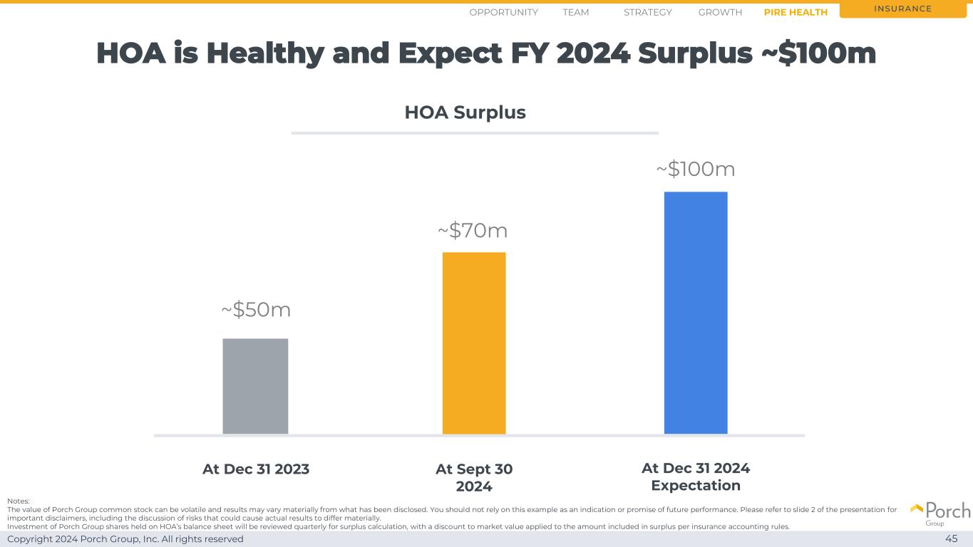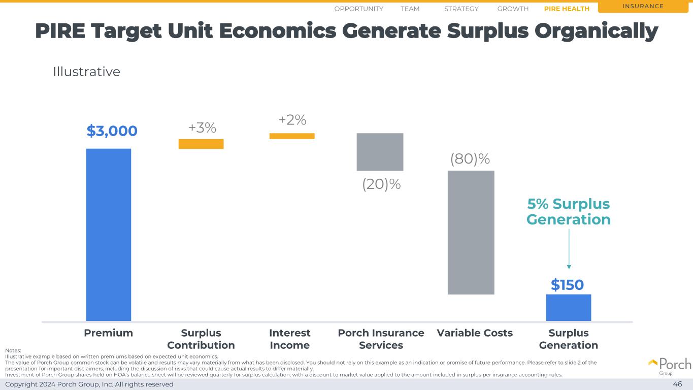Copyright 2024 Porch Group, Inc. All rights reserved HOA is healthy and expects FY 2024盈余~1亿美元45 insurance HOA盈余at Dec 31 2023 at Dec 31 2024 expects~$ 5000万~$ 1亿at Sept 30 2024~$ 7000万注:Porch Group普通股的价值可能会波动,结果可能与已披露的有重大差异。你不应该依赖这个例子作为未来业绩的指示或承诺。请参阅演示文稿的幻灯片2,了解重要的免责声明,包括对可能导致实际结果出现重大差异的风险的讨论。在HOA的资产负债表上持有的Porch Group股票的投资将每季度进行一次盈余计算审查,并对根据保险会计规则计入盈余的金额应用市值折让。Opportunity Strategy GrowthTeam Pire Health