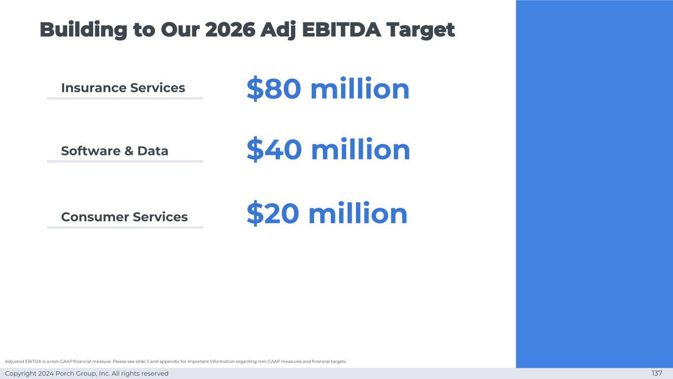 Copyright 2024 Porch Group, Inc. All rights reserved 137 Insurance Services Software & Data Consumer Services 8000万美元4000万美元2000万美元调整后EBITDA是一项非公认会计准则财务指标。有关非GAAP措施和财务目标的重要信息,请参见幻灯片2和附录。实现我们的2026年调整后EBITDA目标
