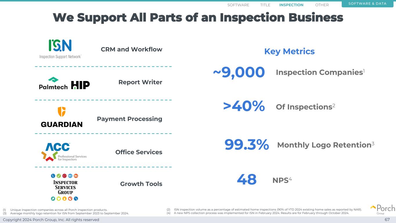 Copyright 2024 Porch Group, Inc. All rights reserved We support all parts of an inspection business software & datainspection OTHER 67 of Inspections2 > 40% inspection companies 1~9000monthly logo retention399.3% NPS448 Key Metrics(1)Unique inspection companies across all porch inspection products。(3)2023年9月至2024年9月ISN月均标识保留量。(2)ISN检验量占估计房屋检验量的百分比(NAR报告的2024年初至今成屋销售的90%)。(4)2024年2月ISN实施新的NPS采集流程。结果为2024年2月至10月。TITLESOFTWARE CRM和Workflow Payment Processing Office Services Report Writer Growth Tools