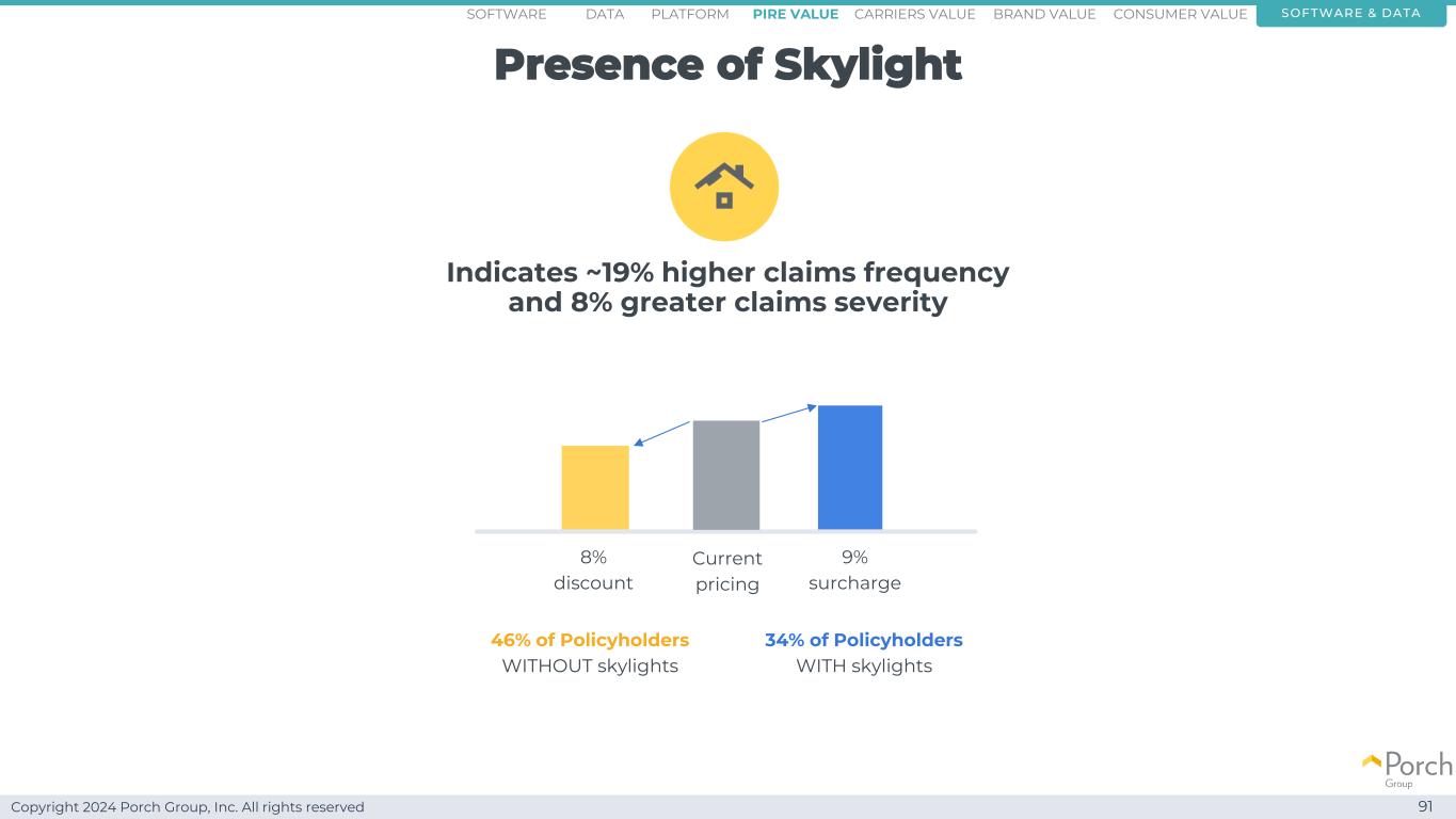 Copyright 2024 Porch Group, Inc. All rights reserved Presence of Skylight 91 indicates~19% higher claims frequency and 8% higher claims seriousness 34% of policyholders with skylights 46% of policyholders without skylights current pricing 9% surchase 8% discount software & dataconsumer valueCarriers valuepire value brand valueplatformsoftware data