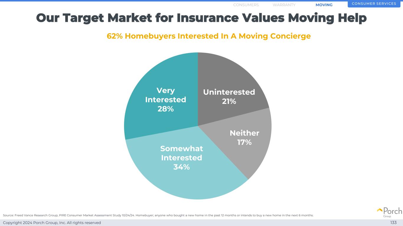 版权所有2024 Porch Group, Inc. All rights reserved uninterested 21% nor 17% somewhat interested 34% very interested 28% Our target market for insurance values moving help 133 consumer services 62% homebuyers interested in a moving concipe source:Freed vance research group,PIRE consumer market assessment study 10/24/24。购房者;任何在过去12个月内购买新房或打算在未来6个月内购买新房的人。MOVINGWARRANTY消费者