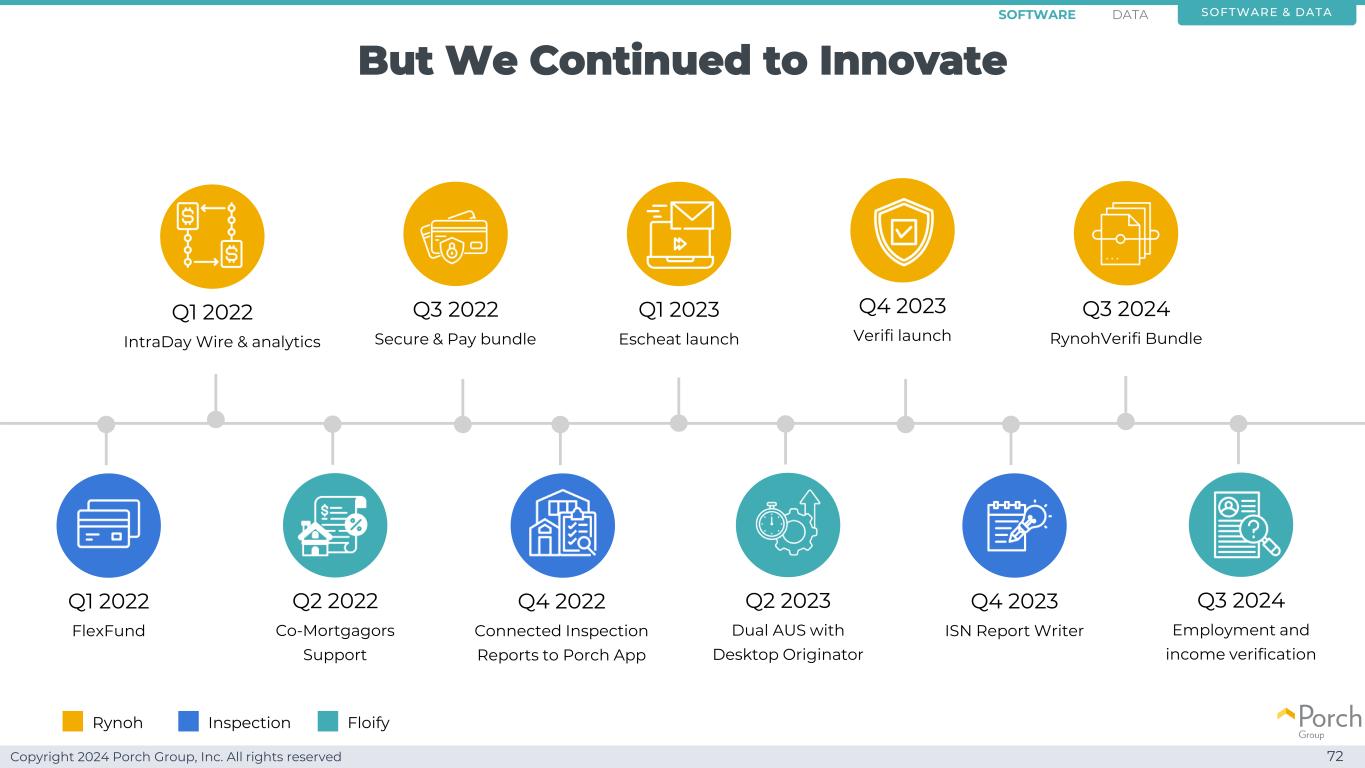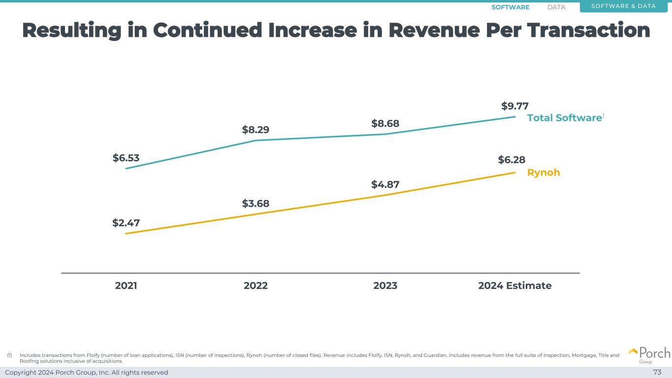 Copyright 2024 Porch Group, Inc. All rights reserved but we continued to innovate 72 IntraDay Wire & Analytics Q1 2022 Secure & Pay Bundle Q3 2022 Verifi launch Q4 2023 Escheat launch Q1 2023 RynohVerifi Bundle Q3 2024 FlexFund Q1 2022 Connected Inspection Reports to Porch App Q4 2022 Co-Mortgagator support Q2 2022 Dual AUS with Desktop Originator Q2 2023 Employment and Income Verification Q3 2024 ISN Report Writer Q4 2023 Rynoh Inspection Floify Software & DATASOFTWAR
