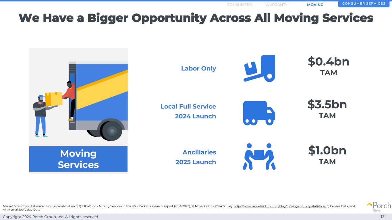 Copyright2024 Porch Group, Inc. All rights reserved We have a bigger opportunity across all moving services 131 consumer services labor only moving services local full service 2024 launch $ 04亿TAM $ 35亿TAM Ancillaries 2025 launch market size notes:estimated from combination of 1)IBISWorld-Moving Services in the US-Market Research Report(2014-2029),2)MoveBuddha 2024 Survey:https://www.movebuddha.com/blog/moving-industry-statistics/,3)Census Data,and 4)internal job value data