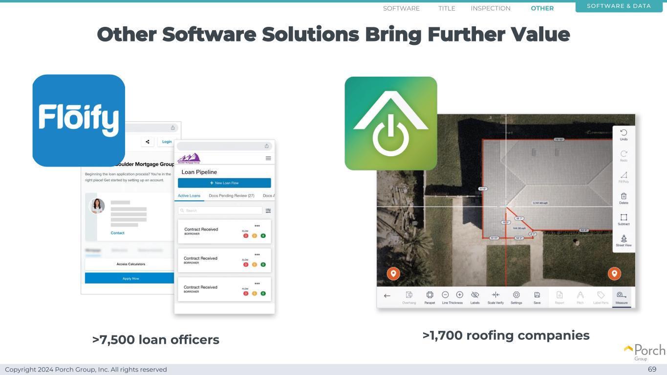 Copyright 2024 Porch Group, Inc. All rights reserved Other software solutions bring further value 69 > 7,500 loss officers > 1,700 roofing companies software & dataotherinspectiontitleSOFTWARE