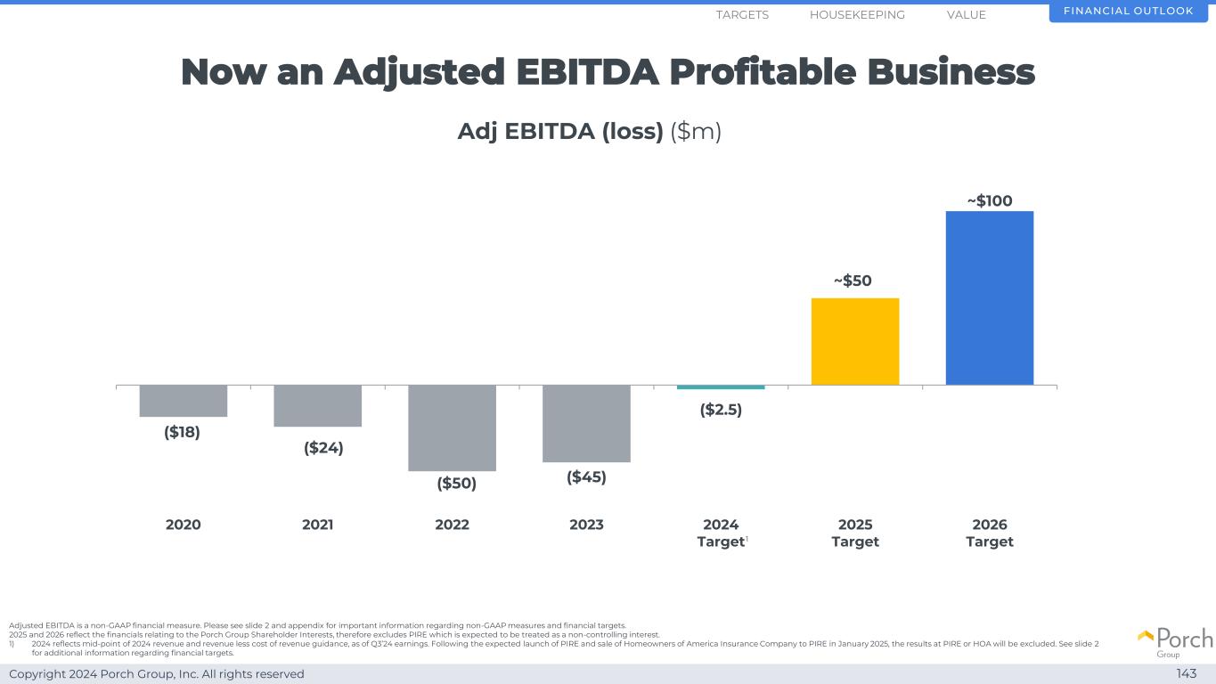 Copyright 2024 Porch Group, Inc. All rights reserved now an adjusted EBITDA profitable business 143 Adj EBITDA(loss)($ m)($ 18)($ 24)($ 50)($ 45)($ 2.5)~$ 50~$ 100202020212021202220232024 Target 2025 Target 2026 Target FINANCIAL OUTLOOKHOUSEKEEPINGETS Adjusted EBITDA is a non-GAAP financial measure。有关非GAAP措施和财务目标的重要信息,请参见幻灯片2和附录。2025和2026年反映了与Porch Group股东权益相关的财务状况,因此不包括预计将被视为非控股权益的PIRE。1)2024年反映了截至24年第三季度收益的2024年收入和收入减去收入成本指引的中点。继预计于2025年1月推出PIRE并将美国保险公司的房主出售给PIRE之后,PIRE或HOA的结果将被排除在外。有关财务目标的更多信息,请参见幻灯片2。1个值