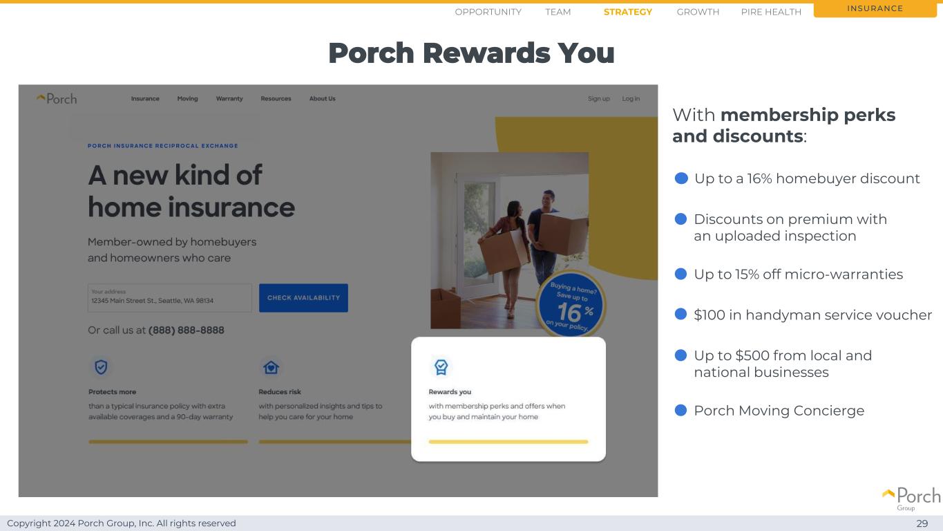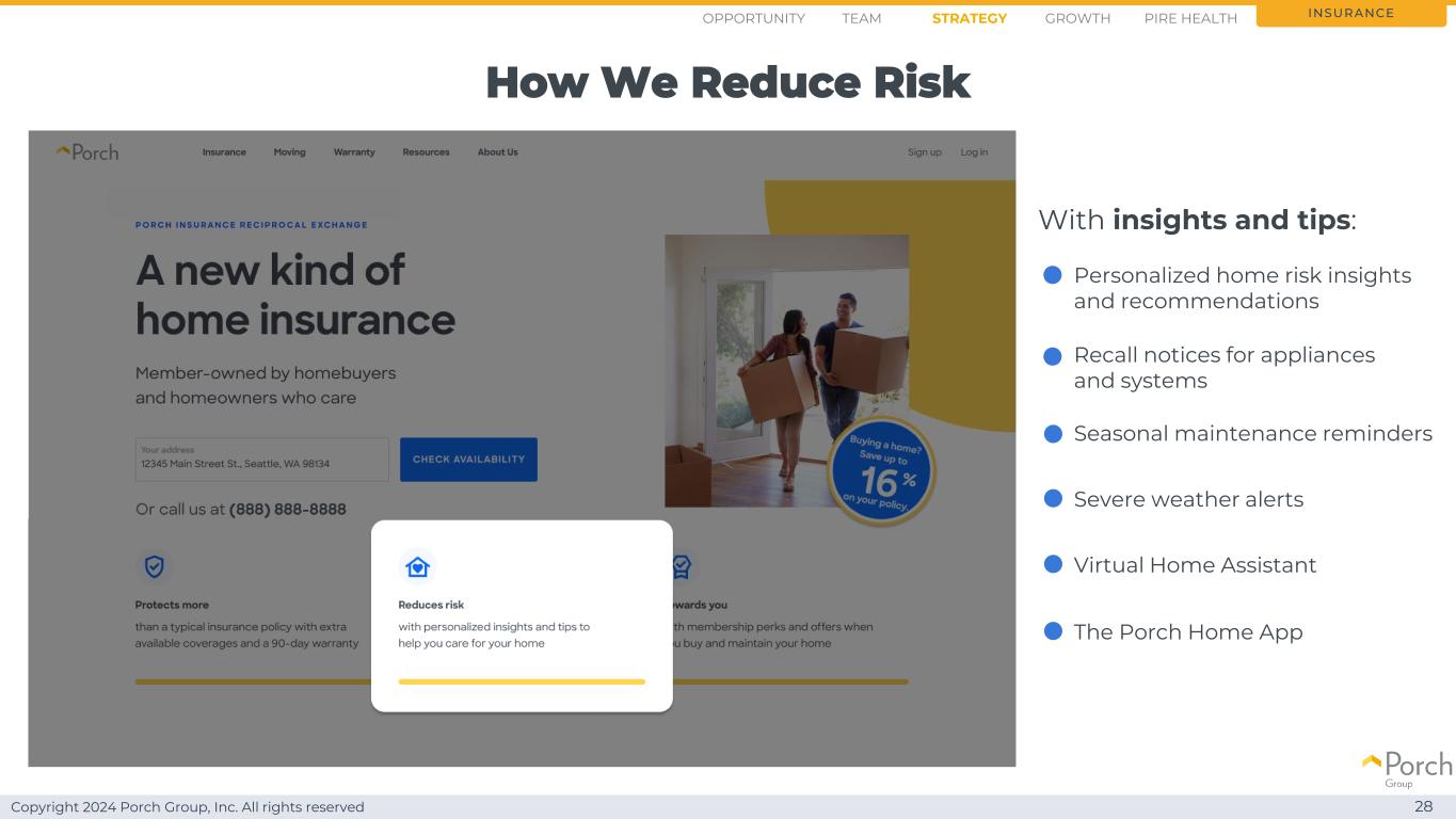Copyright 2024 Porch Group, Inc. All rights reserved with insights and tips:How We Reduce risk insurance personalized home risk insights and recommendations recall notices for appliances and systems Seasonal maintenance reminders Severe weather alerts virtual home assistant The Porch Home App Opportunity Strategy GrowthTEAM PIRE Health 28
