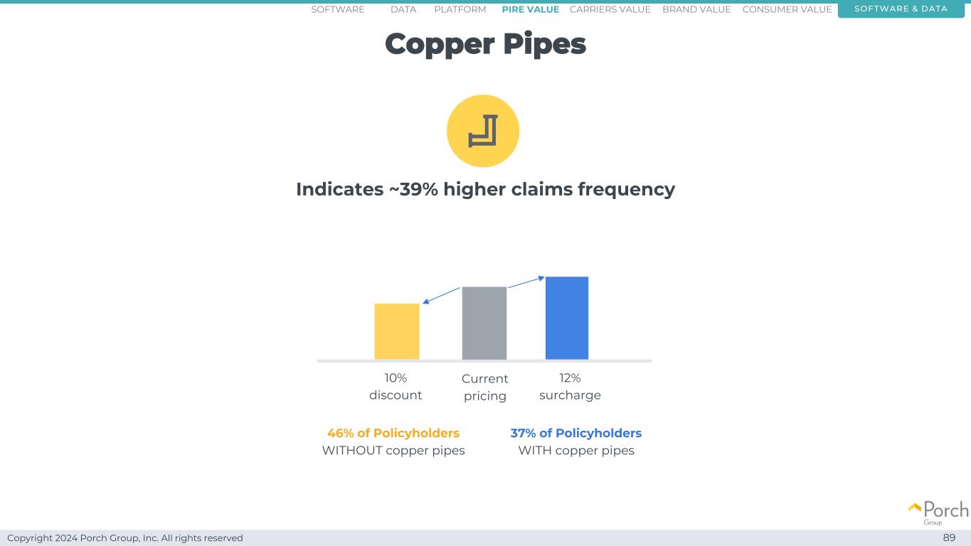 Copyright 2024 Porch Group, Inc. All rights reserved 89 indicates~39% higher claims frequency 37% of policyholders with copper pipe 46% of policyholders without copper pipe current pricing 12% surchase 10% discount software & dataconsumer valueCARRRRIERS valuepire value brand value copper pipe platformsoftware data