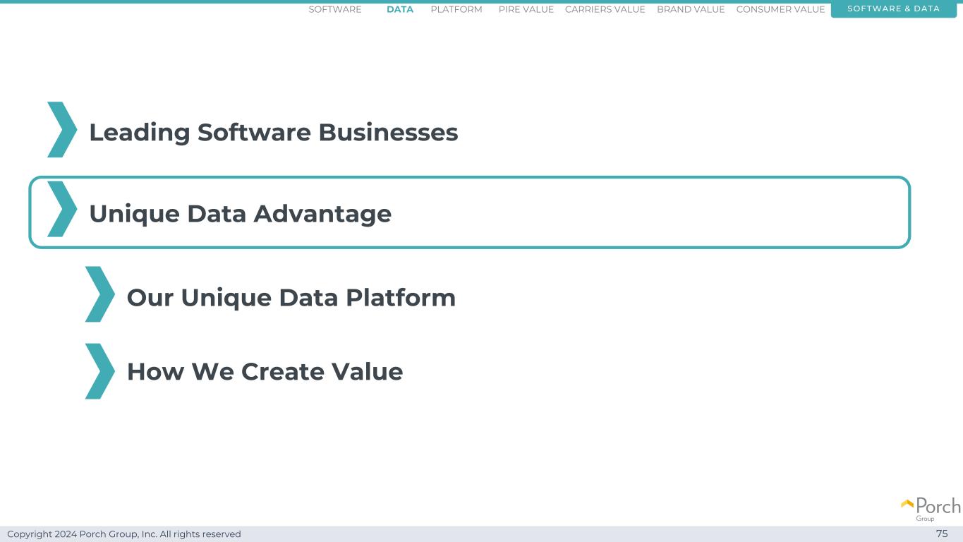 Copyright 2024 Porch Group, Inc. All rights reserved 74 Our unique data platform software & data Nicole Pelley EVP & GM,porch platform software data consumer valuecarriers valuepire value brand valuePlatform
