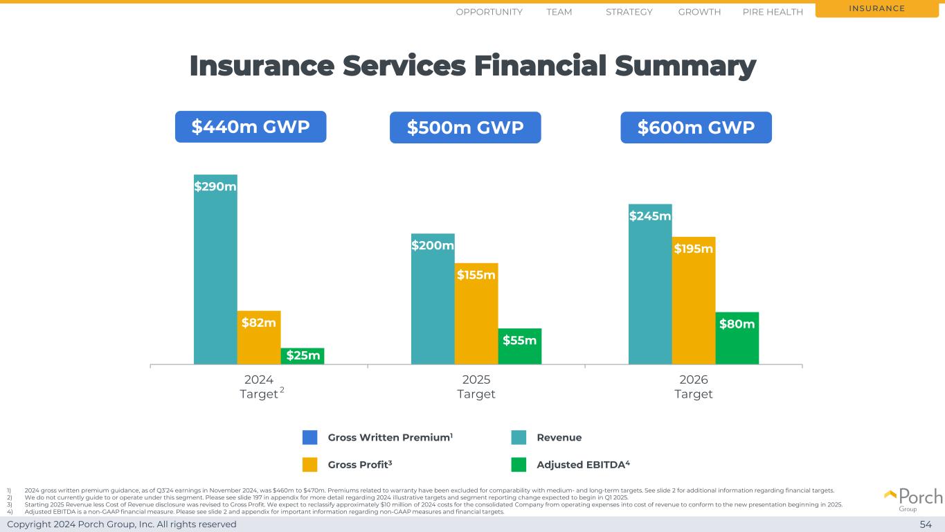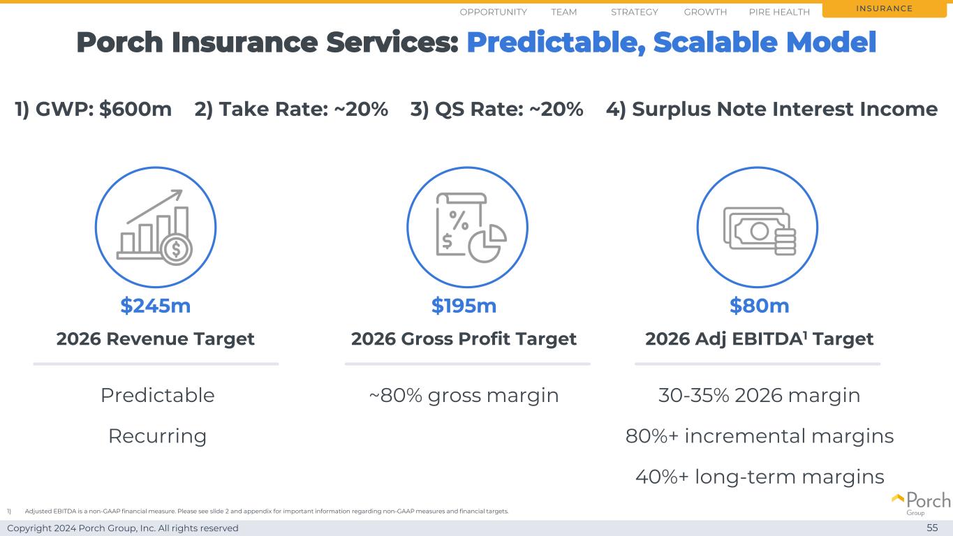 Copyright 2024 Porch Group, Inc. All rights reserved 54 $ 2.90亿美元2亿美元2.45亿美元8.25亿美元1.95亿美元2500万美元0.50亿美元0.80亿美元2024 Target 2025 Target 2026 Target Revenue Gross Profit 3 Adjusted EBITDA4 Insurance Services Financial Summary $ 5亿GWP $ 6亿GWP $ 4.4亿GWP Insurance Gross Written Premium1 21)截至2024年11月第三季度收益,2024年毛承保保费指引为4.6亿美元至4.7亿美元。为与中长期目标的可比性,已排除与保修相关的保费。有关财务目标的更多信息,请参见幻灯片2。2)我们目前没有在这一细分领域进行指导或操作。有关预计将于2025年第一季度开始的2024年说明性目标和分部报告变化的更多详细信息,请参见附录中的幻灯片197。3)2025年起收入减收入成本披露修正为毛利。我们预计将把合并后公司2024年成本中的约1000万美元从运营费用重新分类为收入成本,以符合从2025年开始的新列报方式。4)调整后EBITDA是一种非GAAP财务指标。有关非GAAP措施和财务目标的重要信息,请参见幻灯片2和附录。Opportunity Strategy GrowthTeam Pire Health
