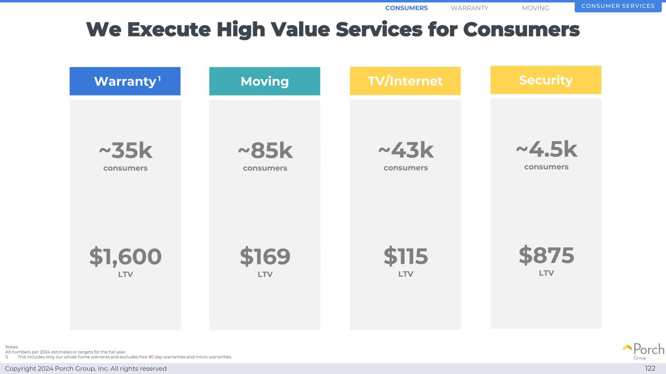 Copyright 2024 Porch Group, Inc. All rights reserved We execute high value services for consumers 122 consumer services SMOVINGWARRANTYCONSUMERS warranty~35k consumers $ 1600 LTV moving~85k consumers $ 169 LTV TV TV/Internet~43k consumers $ 115 LTV security~4.5k consumers $ 875 LTV 1 notes:all numbers per 2024 estimates or target for the full year。1)这仅包括我们的整家权证,不包括免费的90天保修和微保修。
