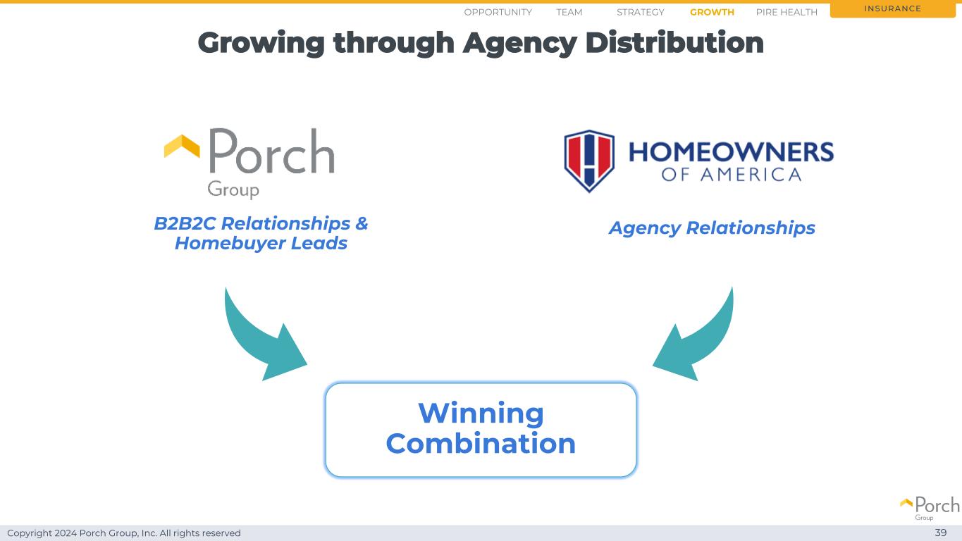 版权所有2024 Porch Group, Inc. All rights reserved growing through agency distribution 39 insurance B2B2C relationships & homebuyer leads agency relationships winning combination opportunity strategy growthteam PIRE health