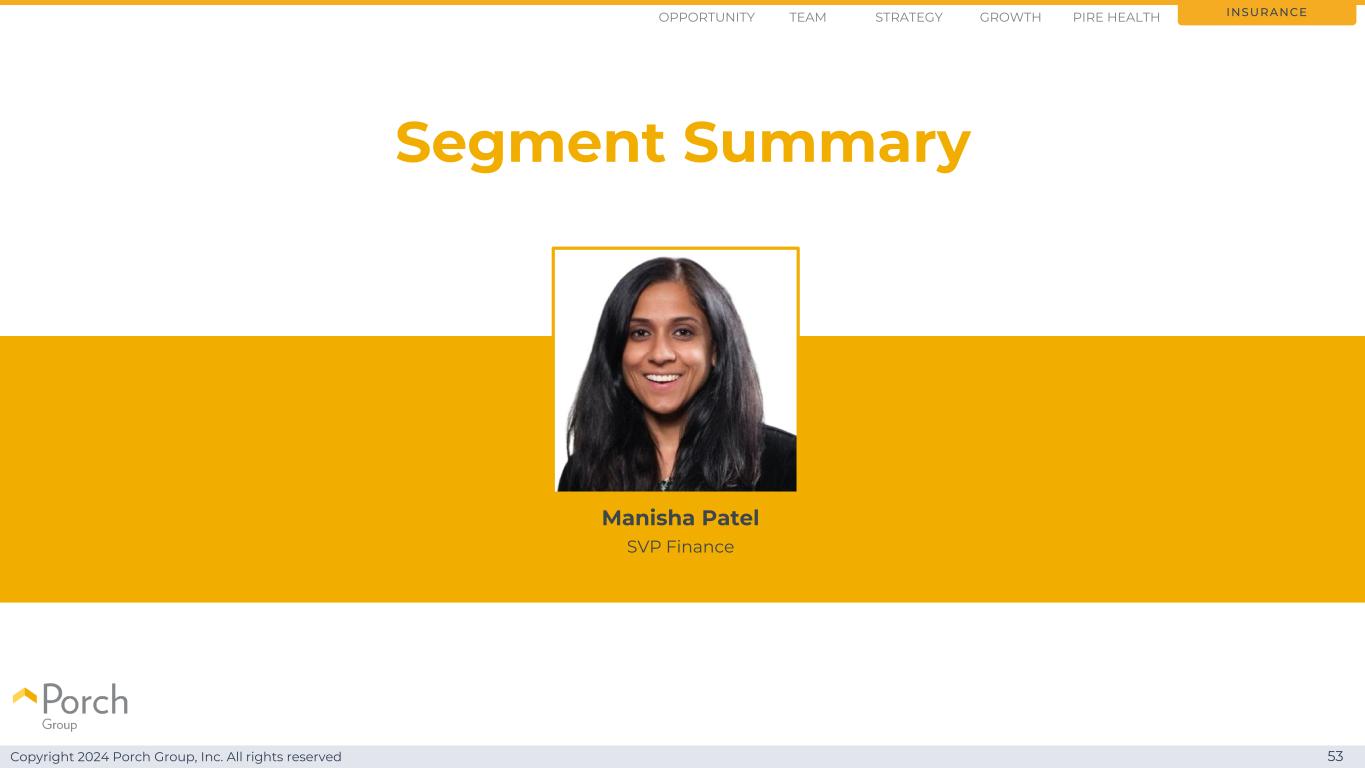 Copyright 2024 Porch Group, Inc. All rights reserved Porch Captive increases premium capacity by > 50% 52 Insurance baseline rate at reciprocal $ 5亿GWP需要1.67亿美元5:1 GWP:盈余3:1 GWP:盈余7:1 GWP:盈余混合有效率$ 5亿GWP需要$ 1亿Porch Captive rate(non-weather QS)$ 5亿GWP需要$ 7100万Opportunity Strategy Growth TEAM PIRE Health