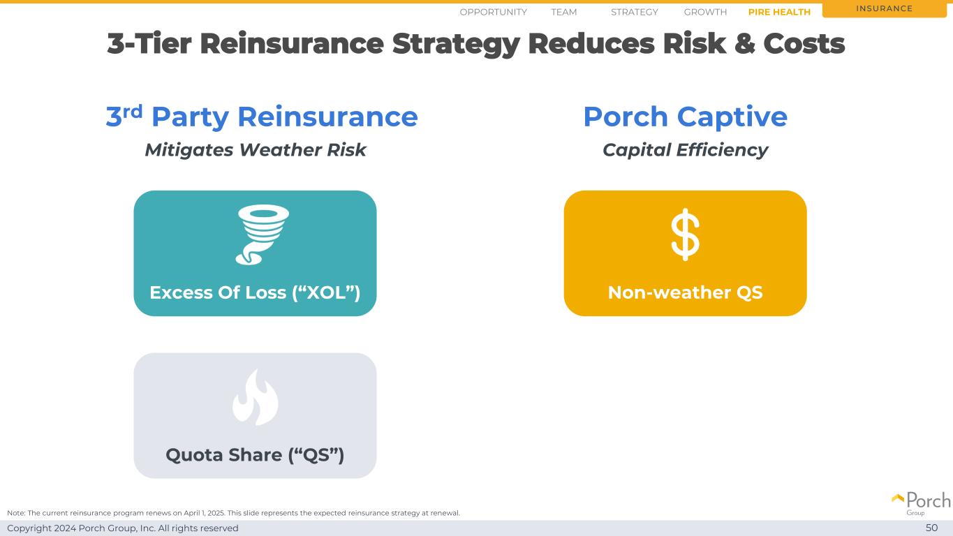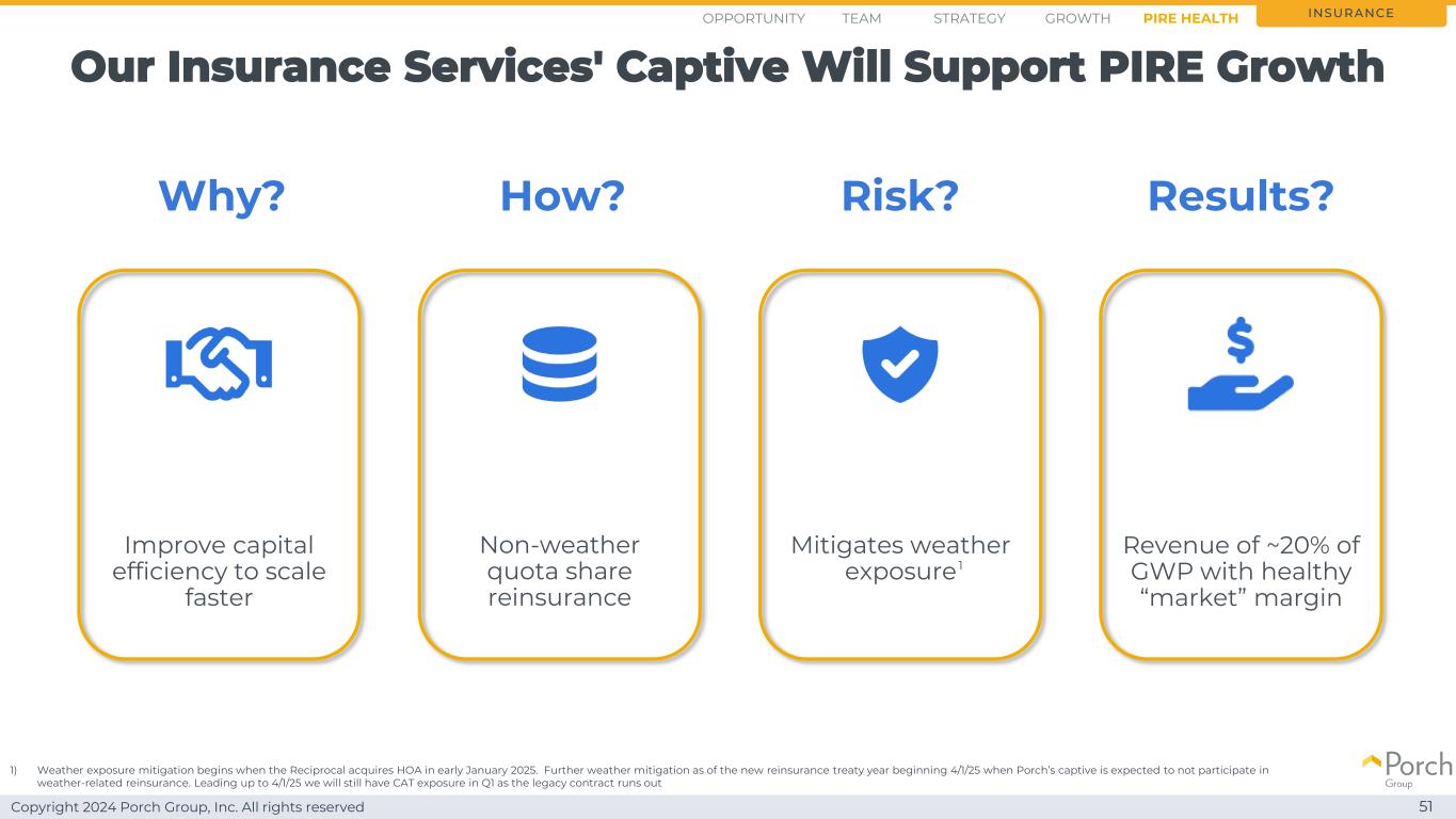 版权所有2024 Porch Group, Inc. All rights reserved 3-tier reinsurance strategy reduces risk & costs 50 Insurance Note:当前的再保险计划于2025年4月1日更新。这张幻灯片代表了续保时的预期再保险策略。超额损失(“XOL”)配额份额(“QS”)3rd party reinsurance porch captive non-weather QS缓解天气风险资本效率机会战略growthteam pire health