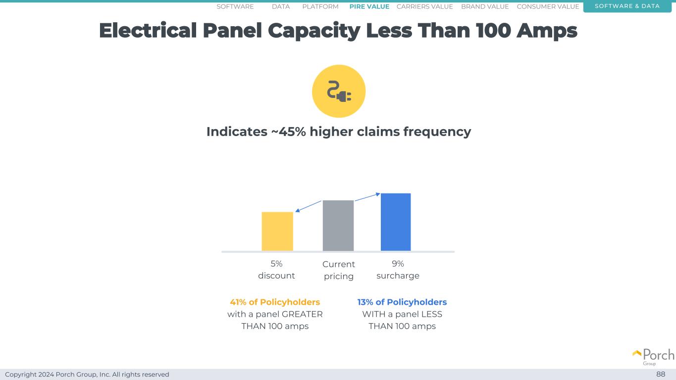 Copyright 2024 Porch Group, Inc. All rights reserved Electrical Panel capacity less than 100 amps 88 indicates~45% higher claims frequency 13% policyholders with a copanel less than 100 amps 41% policyholders with a copanel greater than 100 amps current pricing 9% surchase 5% discount software & dataconsumer valueCarriers valuepire value brand valueplatformsoftware data