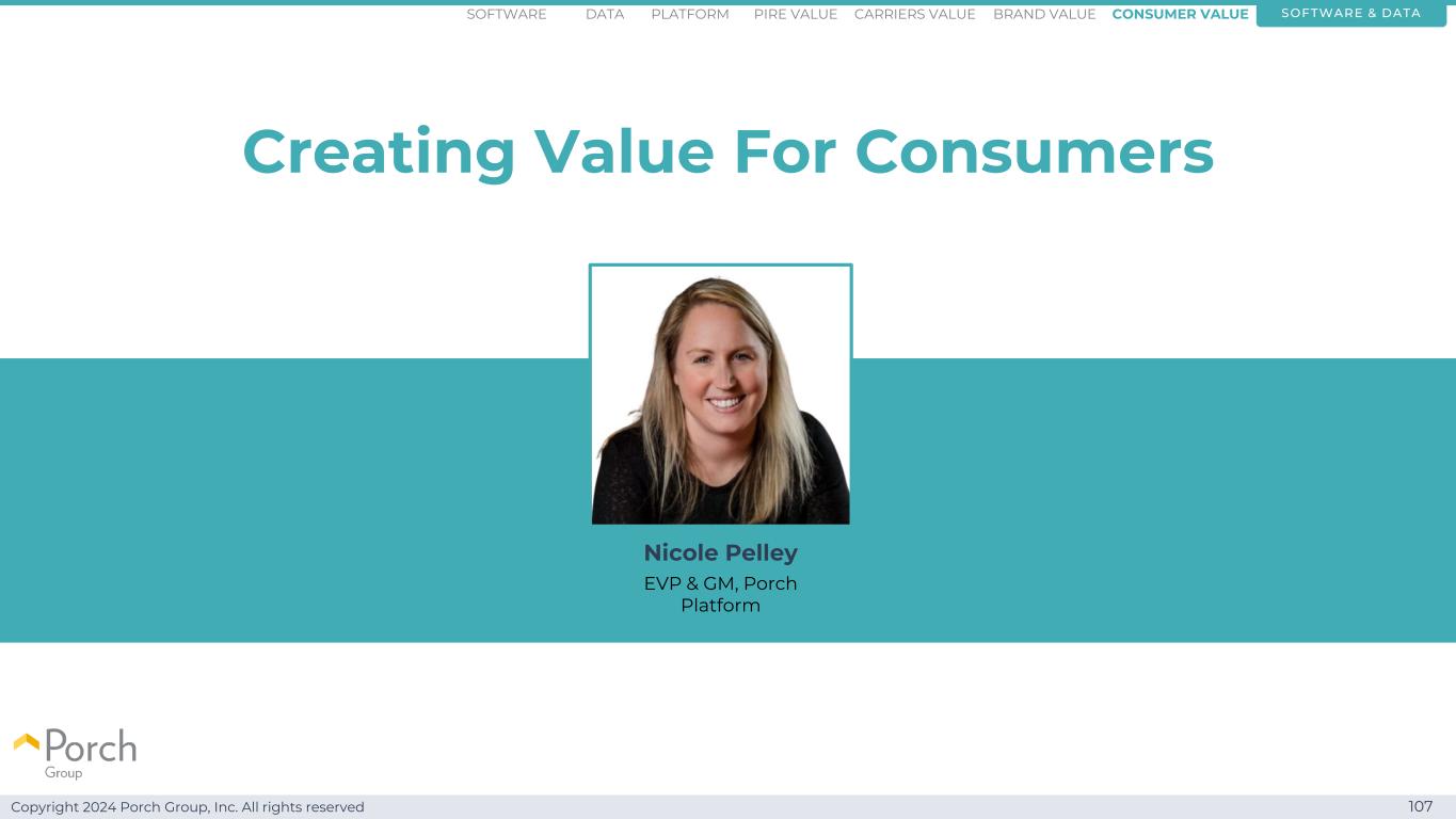 Copyright 2024 Porch Group, Inc. All rights reserved 107 Creating value for consumers software & datacConsummer valuebrand valuecarriers valuepire valuePlatformsoftware data Nicole Pelley EVP & GM,porch platform