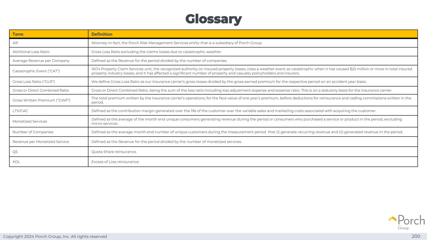 Copyright 2024 Porch Group, Inc. All rights reserved Glossary 200 term definition丨AIF Attorney-in-fact,Porch Risk Management Services entity,its subsidiary of Porch Group。减损损失率毛损失率剔除灾害天气造成的索赔损失。每家公司的平均收入定义为该期间的收入除以公司数量。灾难性事件(“CAT”)ISO的财产索赔服务部门,即公认的保险财产损失主管机构,当天气事件导致保险财产行业总损失达到或超过2500万美元时,将其归类为灾难性事件,并影响了大量的财产和伤亡投保人和保险公司。毛损失率(“GLR”)我们将毛损失率定义为我们的保险公司的毛损失除以事故年度基础上相应期间的毛赚保费。毛或直接合并比率毛或直接合并比率,是包括损失调整费用和费用率的损失率之和。这是保险承运人的法定依据。毛承保保费(Gross Written Premium,简称“GWP”)保险承运人运营承保的总保费,按一年保费的面值计算,在扣除该期间承保的再保险和分出佣金之前。LTV/CAC定义为在客户的整个生命周期内产生的边际贡献超过与获取客户相关的可变销售和营销成本。货币化服务定义为在该期间产生收入的月末唯一消费者或在该期间购买服务或产品的消费者的平均值,不包括微服务。定义为(i)在该期间产生经常性收入和(ii)在该期间产生收入的独立客户的平均月末数量的公司数量。每项货币化服务的收入定义为该期间的收入除以货币化服务的数量。QS配额份额再保险。XOL超额损失再保险。