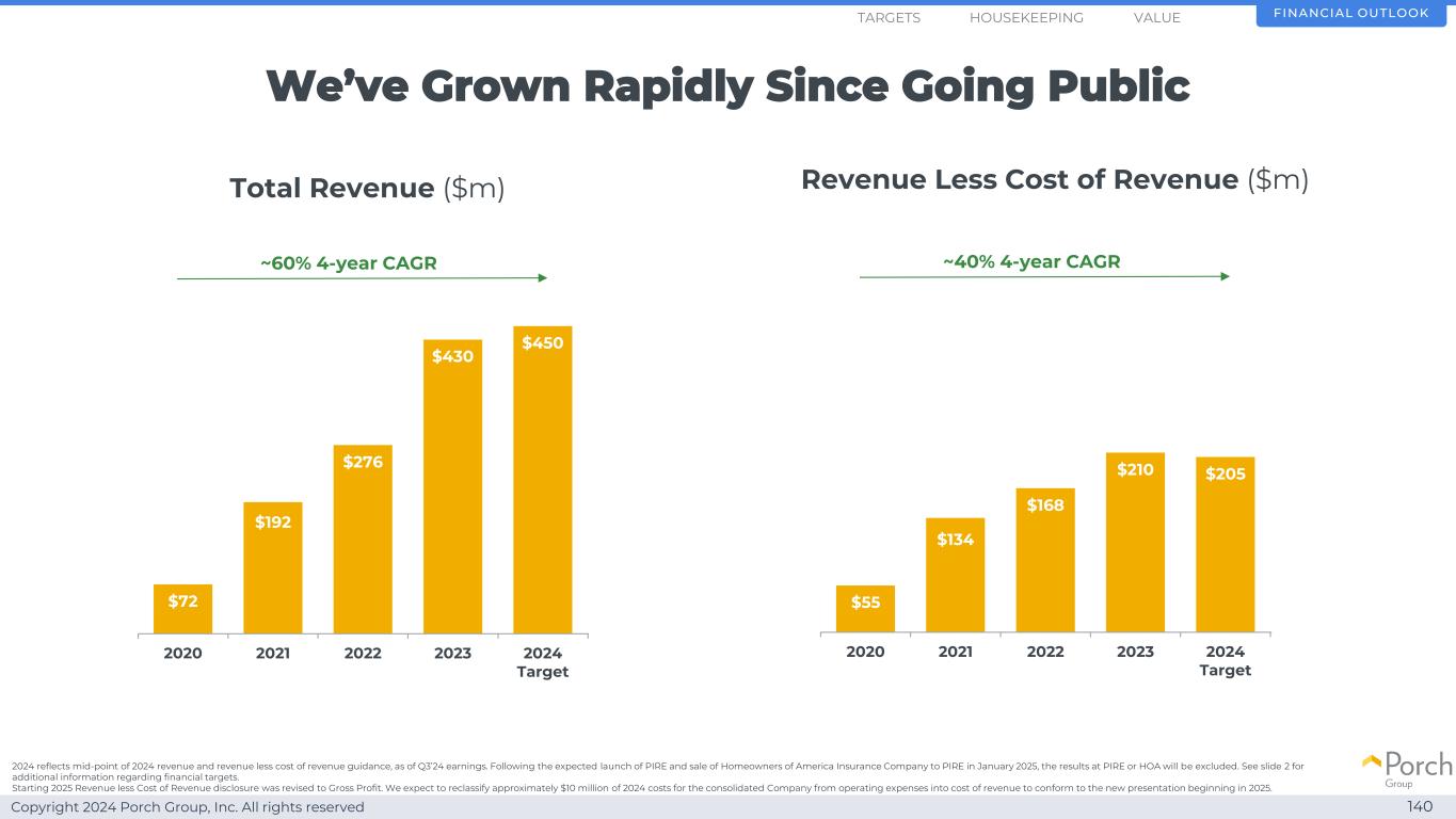 Copyright 2024 Porch Group, Inc. All rights reserved We've grown rapidly since going public 140 $ 72 $ 192 $ 276 $ 430 $ 450 $ 375 $ 45020202021202220232024 Target 2025 Target 2026 Target Total Revenue($ m)Revenue less Cost of Revenue($ m)~60% 4年复合年增长率$ 55 $ 134 $ 168 $ 210 $ 205 $ 300 $ 3652020202020212022202220232024 Target 2025 Target 2026 Target~40% 4年复合年增长率Financial OutlookHOUSEKEEPEPINGETS 2024反映了2024年收入的中点和收入减去收入成本指引,截至24年第三季度收益。继预计于2025年1月推出PIRE并将美国保险公司的房主出售给PIRE之后,PIRE或HOA的结果将被排除在外。有关财务目标的更多信息,请参见幻灯片2。2025年起收入减收入成本披露修正为毛利。我们预计将把合并后公司2024年成本中的约1000万美元从运营费用重新分类为收入成本,以符合从2025年开始的新列报方式。价值