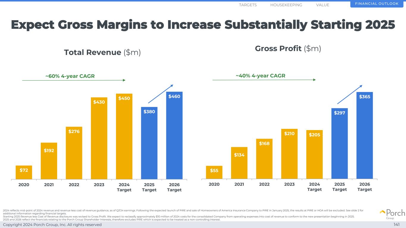 Copyright 2024 Porch Group, Inc. All rights reserved expect gross margins to be substantially increased starting 2025141 $ 72 $ 192 $ 276 $ 430 $ 430 $ 450 $ 380 $ 46020202021202220232024 Target 2025 Target 2026 Target Gross Profit($ m)~60% 4年CAGR $ 55 $ 134 $ 168 $ 210 $ 205 $ 297 $ 365202020212022202220232024 Target 2025 Target 2026 Target~40% 4年CAGR financial outlook HOUSEKEEPEPINGETS total revenue($ m)2024 reflects mid-point of 2024 revenue and revenue less cost of revenue guidance,as of Q3继预计于2025年1月推出PIRE并将美国保险公司的房主出售给PIRE之后,PIRE或HOA的结果将被排除在外。有关财务目标的更多信息,请参见幻灯片2。2025年起收入减收入成本披露修正为毛利。我们预计将把合并后公司2024年成本中的约1000万美元从运营费用重新分类为收入成本,以符合从2025年开始的新列报方式。2025和2026年反映了与Porch Group股东权益相关的财务状况,因此不包括预计将被视为非控股权益的PIRE。价值