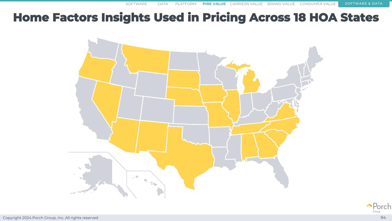 Copyright 2024 Porch Group, Inc. All rights reserved Home Factors Insights used in pricing across 18 HOA states 94 software & dataconsumer valuecarriers valuepire value brand valuePlatformsoftware data