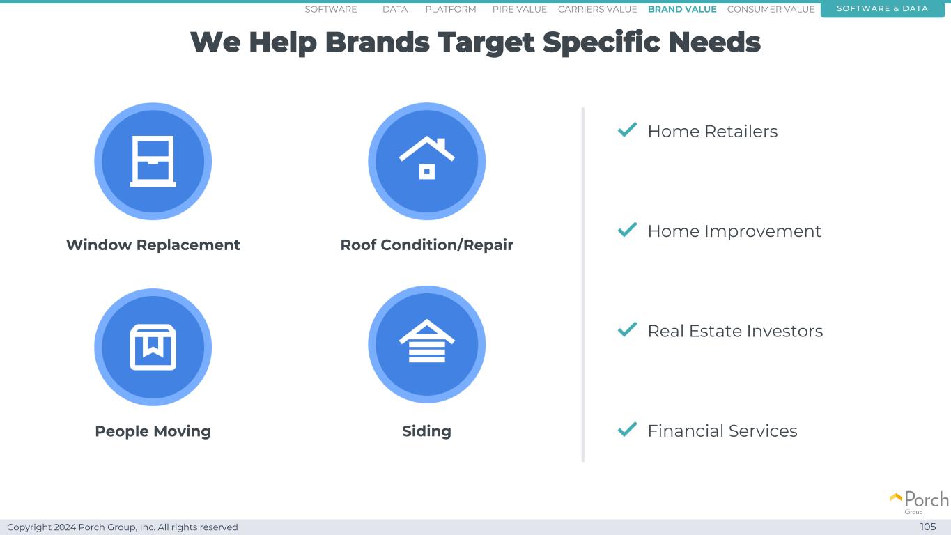 Copyright 2024 Porch Group, Inc. All rights reserved We help brands target specific needs 105 home retailers home improvement real estate investors financial services window replacement roof condition/repair people moving siding software & data consumer valuebrand valueCarriers valuepire valueplatformsoftware data