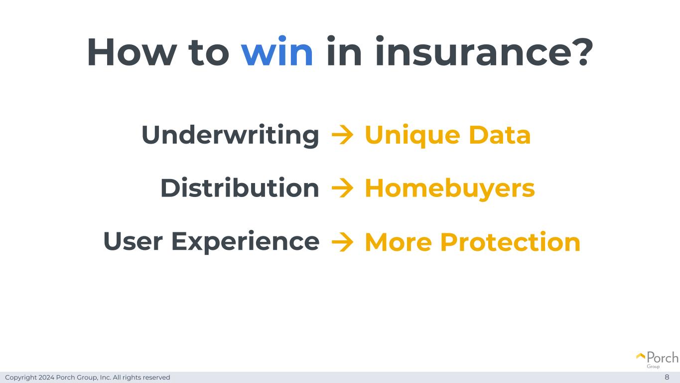 Copyright 2024 Porch Group, Inc. All rights reserved How to win in insurance?8承保分销用户体验→独特数据→购房者→更多保障