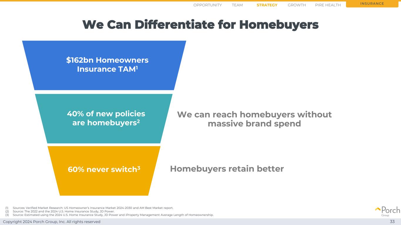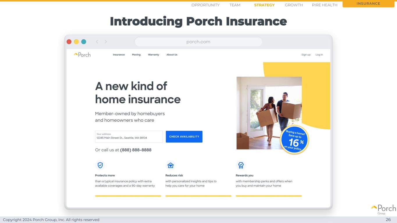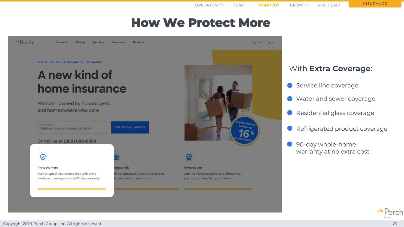Copyright 2024 Porch Group, Inc. All rights reserved Introduction Porch Insurance 26 Insurance Opportunity Strategy Growth Team PIRE Health