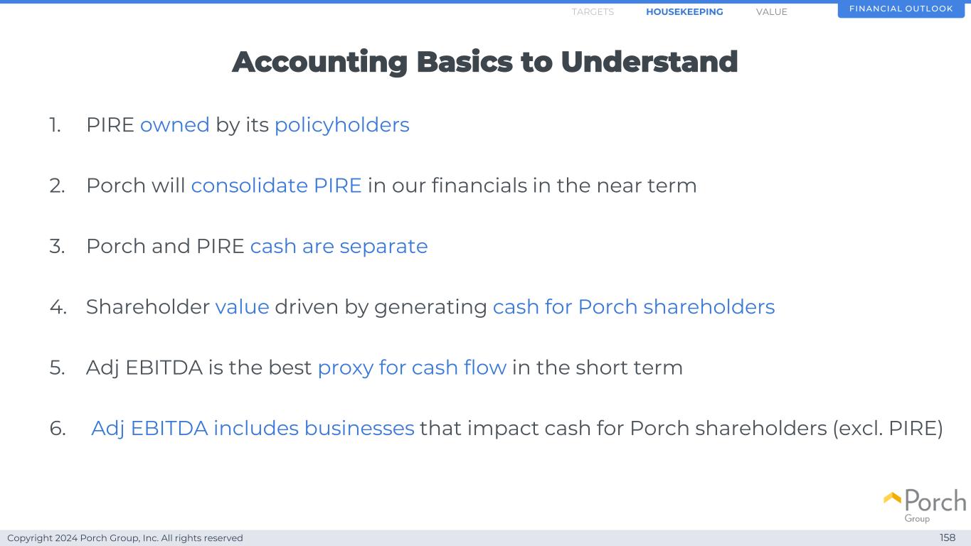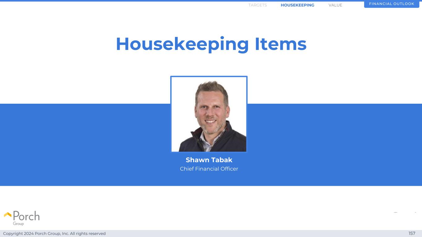Copyright 2024 Porch Group, Inc. All rights reserved 157 Housekeeping items Finance OutlookHOKHOUSEKEEPINGARGETS Shawn Tabak丨首席财务官丨值