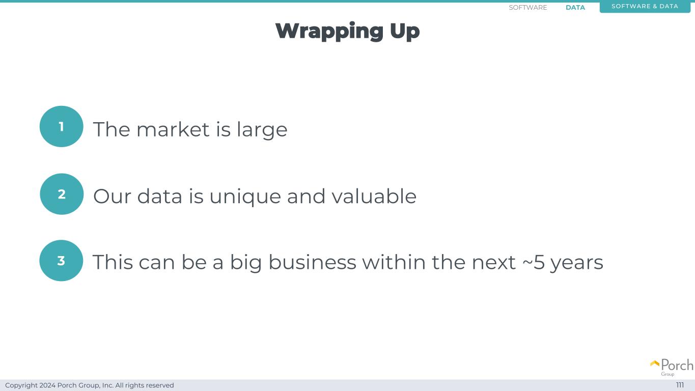 Copyright 2024 Porch Group, Inc. All rights reserved Wrapping Up 111 Our data is unique and valuable this can be a big business within the next~5 years the market is large 132 Software & DATASOFTWARE DATA