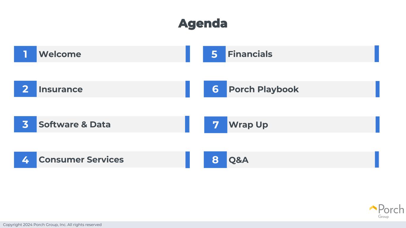 Copyright 2024 Porch Group, Inc. All rights reserved Agenda Welcome Consumer Services Insurance Financials Software & Data 12345 Porch Playbook Wrap Up Q & A 678