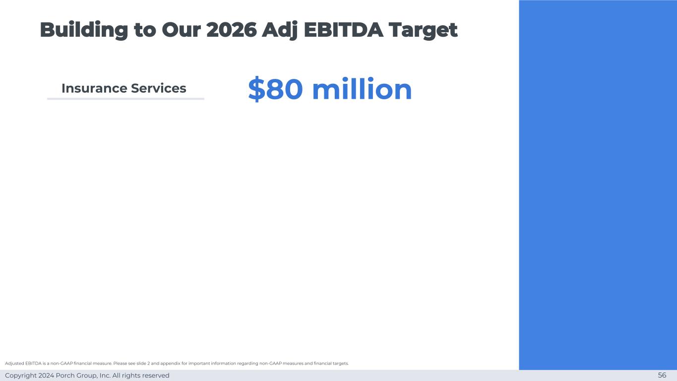 Copyright 2024 Porch Group, Inc. All rights reserved building to our 2026 Adj EBITDA Target 56 Insurance Services $ 80 million adjusted EBITDA is a non-GAAP financial measure。有关非GAAP措施和财务目标的重要信息,请参见幻灯片2和附录。