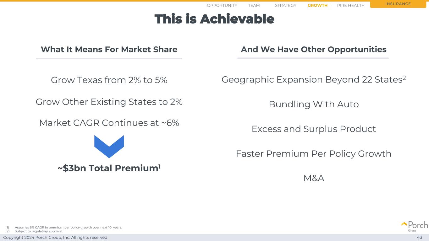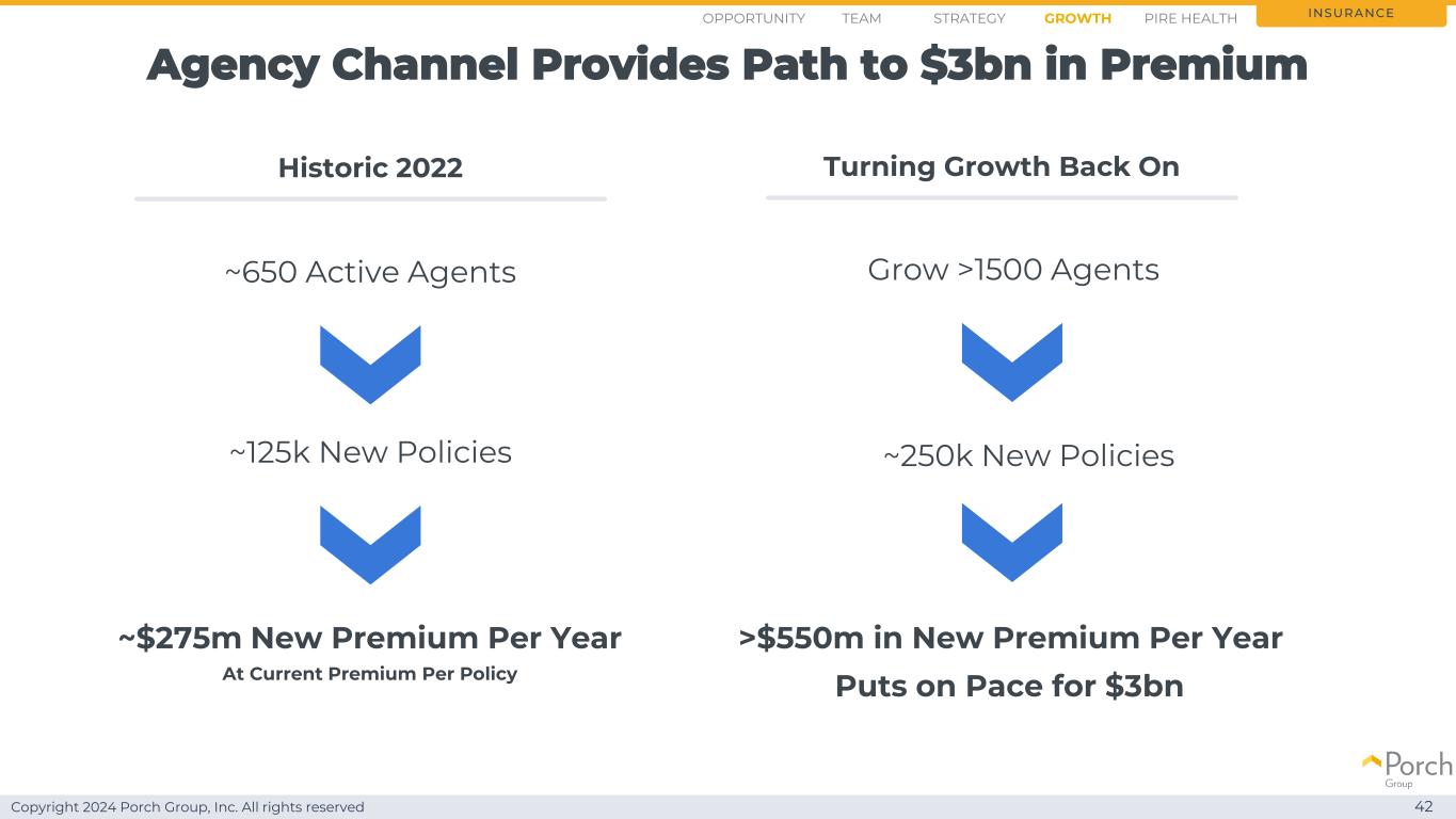Copyright 2024 Porch Group, Inc. All rights reserved agency channel provides path to $ 30亿premium 42 insurance historic 2022 turning growth back on~650 active agents~12.5万new policies~$ 2.75亿new premium per year at current premium per policy grow > 1500 agents~25.0万new policies > $ 5.5亿new premium per year puts on pace for $ 30亿opportunity strategy growthteam PIRE health