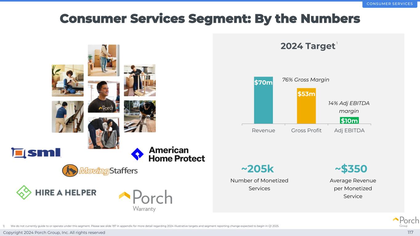 Copyright 2024 Porch Group, Inc. All rights reserved Consumer Services Segment:by numbers 117 $ 700m $ 5300万$ 100m revenue gross profit adj EBITDA~$ 350平均每项货币化服务收入~20.5万货币化服务数量2024 target 76% gross margin 14% adj EBITDA margin consumer services 1)我们目前不指导或在该分部下运营。有关预计将于2025年第一季度开始的2024年说明性目标和分部报告变化的更多详细信息,请参见附录中的第197张幻灯片。1