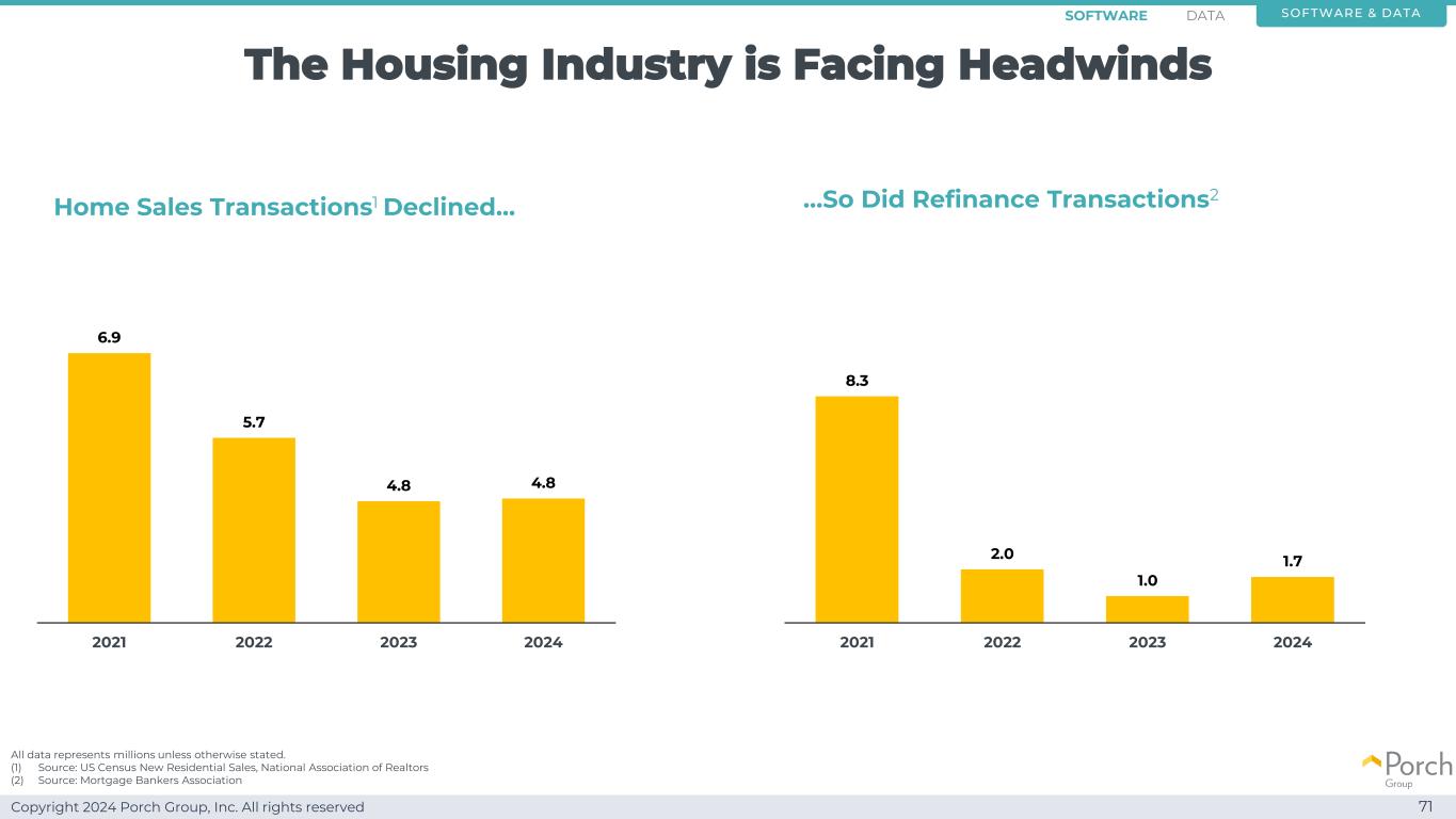 Copyright 2024 Porch Group, Inc. All rights reserved The Housing Industry is Facing Headwinds 71除非另有说明,否则所有数据代表数百万。(1)资料来源:美国人口普查新住宅销售,全美房地产经纪人协会(2)资料来源:抵押银行家协会房屋销售交易1下降…6.95.7 4.84.8 2021202220232024…再融资交易也是如此28.3 2.0 1.0 1.7 2021202220232024软件和数据软件数据