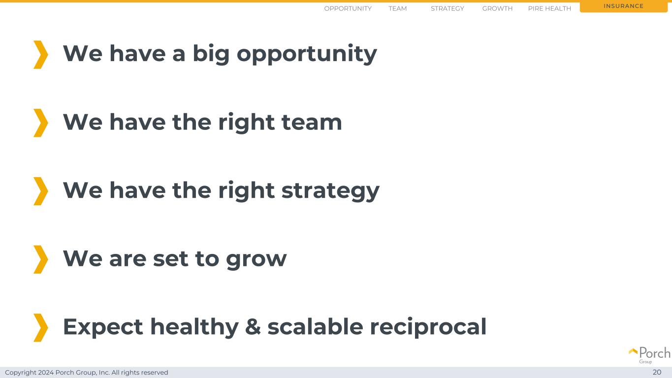 版权所有2024 Porch Group, Inc. All rights reserved 20 Opportunity Strategy Growth PIRE Health我们有一个大机会我们有合适的团队我们有合适的战略我们准备发展保险期望健康且可扩展的互惠团队