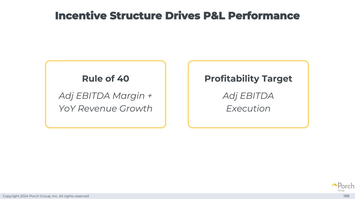 Copyright 2024 Porch Group, Inc. All rights reserved Incentive StructureDrives P & L performance 188 Rule of 40 Adj EBITDA margin + YoY revenue growth profitability target Adj EBITDA execution