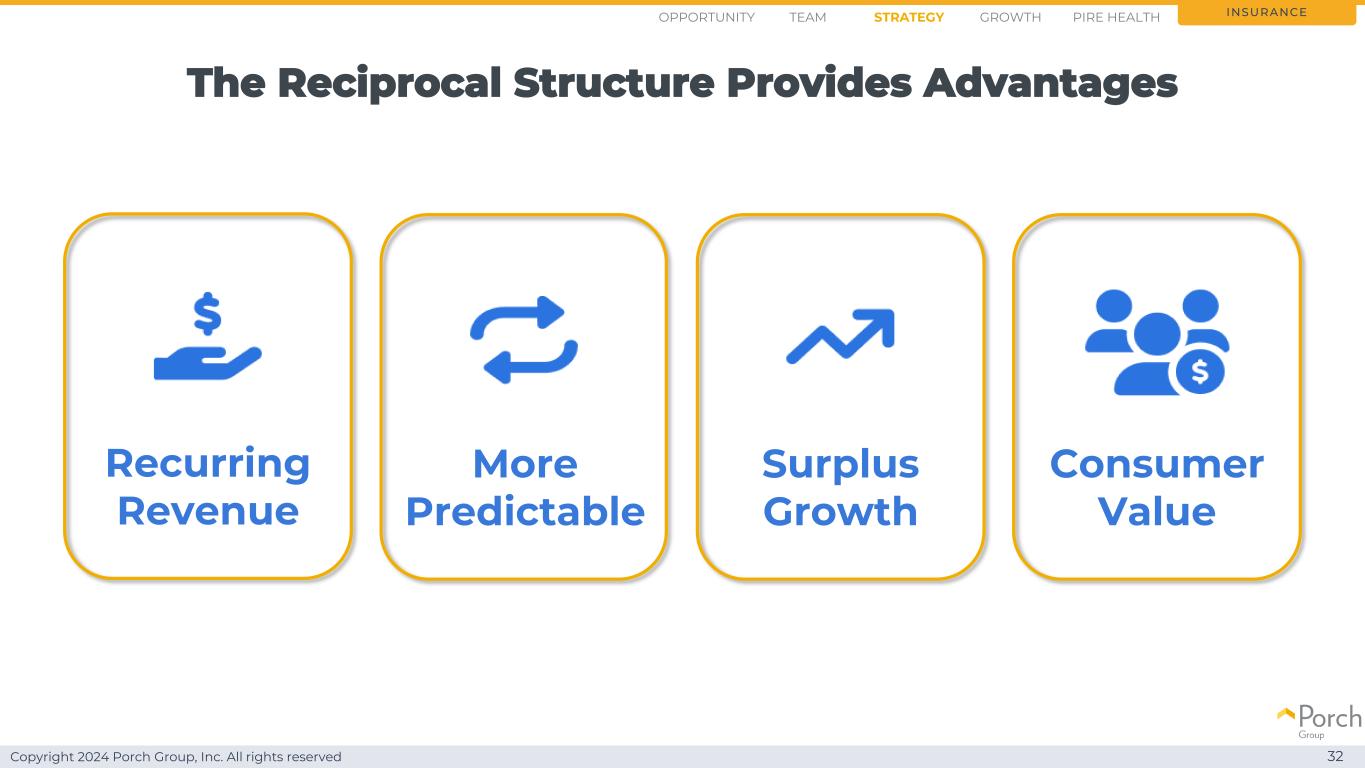 Copyright 2024 Porch Group, Inc. All rights reserved The reciprocal丨structure 丨Structure提供优势32 insurance recurring revenue更可预测的盈余增长消费者价值机会战略growthteam PIRE health