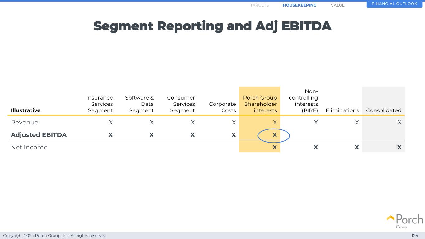 Copyright 2024 Porch Group, Inc. All rights reserved Illustrative Insurance Services Segment Software & Data Segment Consumer Services Segment Corporate Costs CHIRE(PIRE)eliminates Consolidated Revenue X X X X X X X X XX XX Adjusted EBITDA X X X Net Income X X X159 Financial OutlookHOUSEKEEPINGETS Segment Reporting and Adj EBITDA VALUE