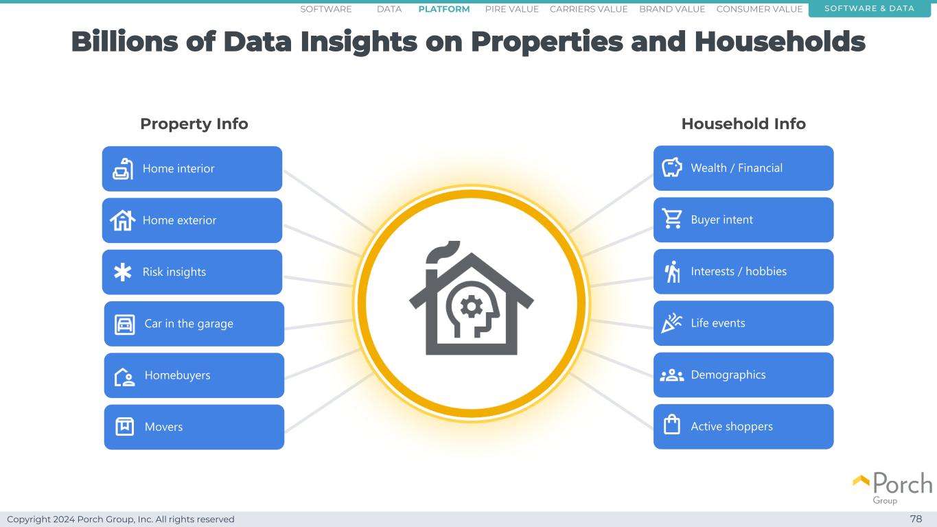 Copyright 2024 Porch Group, Inc. All rights reserved Billions of Data Insights on Properties and Households Software & DATA DemographicsHomebuyers Home Interior Home Outior Risk Insights Movers Car in the Garage Life Events Interests/Hobbies Buyer Intent Wealth/Financial Active Shoppers Household InfoProperty Info Consumer ValueCarriers ValuePIRE价值品牌价值平台软件数据78