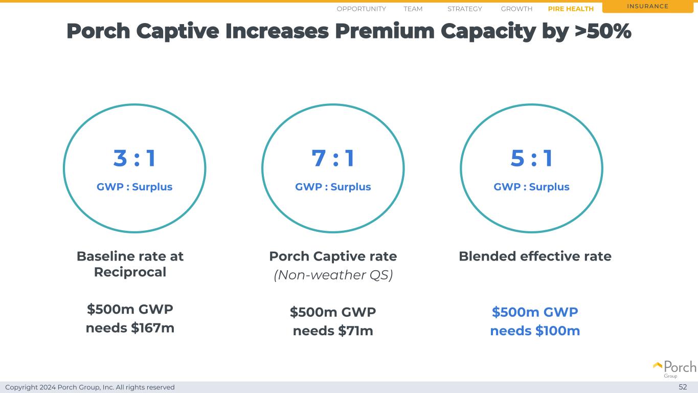 Copyright 2024 Porch Group, Inc. All rights reserved Our Insurance Services ' Captive will support PIRE growth 51 insurance improves capital efficiency to scale faster Non-weather配额份额再保险以健康的“市场”边际缓解天气风险收入约为GWP的20% Why?怎么做?风险?结果?1)天气暴露缓解始于2025年1月初互惠获得HOA。从4/1/25开始的新的再保险条约年度开始,预计波奇的俘虏将不会参与与天气相关的再保险,从而进一步缓解天气问题。领先至4/1/25我们仍将在第一季度有CAT曝光,因为遗留合同耗尽了机会战略增长团队PIRE Health 1