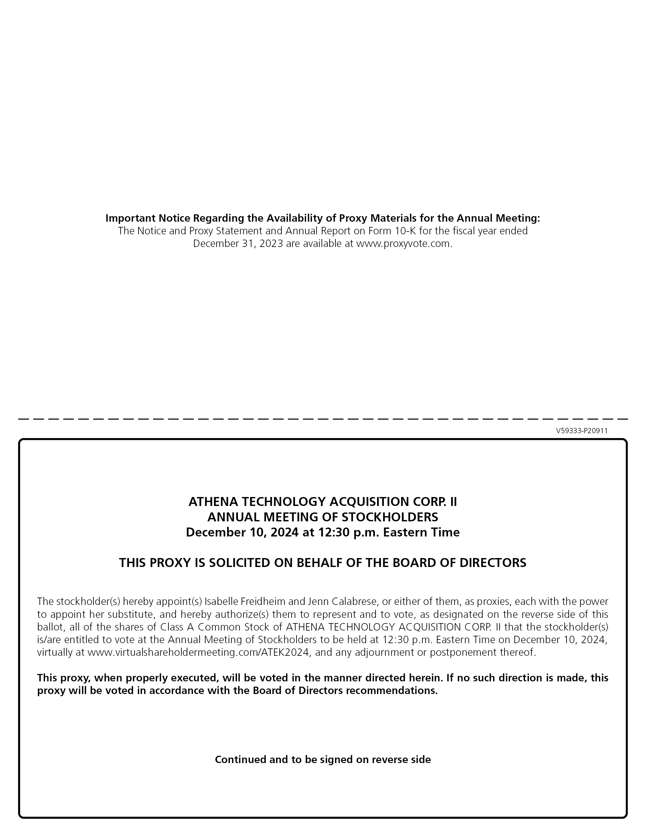 关于年会代理材料可用性的重要通知:截至2023年12月31日的财政年度的通知、代理声明和10-K表格年度报告可在www.proxyvote.com上查阅。V59333-P20911雅典娜技术收购公司。II年度股东大会美国东部时间2024年12月10日下午12:30该代理权是代表董事会征求的股东特此任命Isabelle Freidheim和Jenn Calabrese或他们中的任何一位作为代理人,各自有权任命她的替代者,并特此授权他们代表并投票(如本投票反面指定的)ATHENA TECHNOLOGY ACQUISITION CORP. A类普通股的所有股份。II股东有/有权在东部时间2024年12月10日下午12:30举行的年度股东大会上投票,实际上是在www.virtualshareholdermeeting.com/ATEK2024,以及任何休会或延期。此代理,当正确执行时,将按照此处指示的方式进行投票。如果没有做出这样的指示,这个代理将按照董事会的建议进行投票。续并将于反面签署