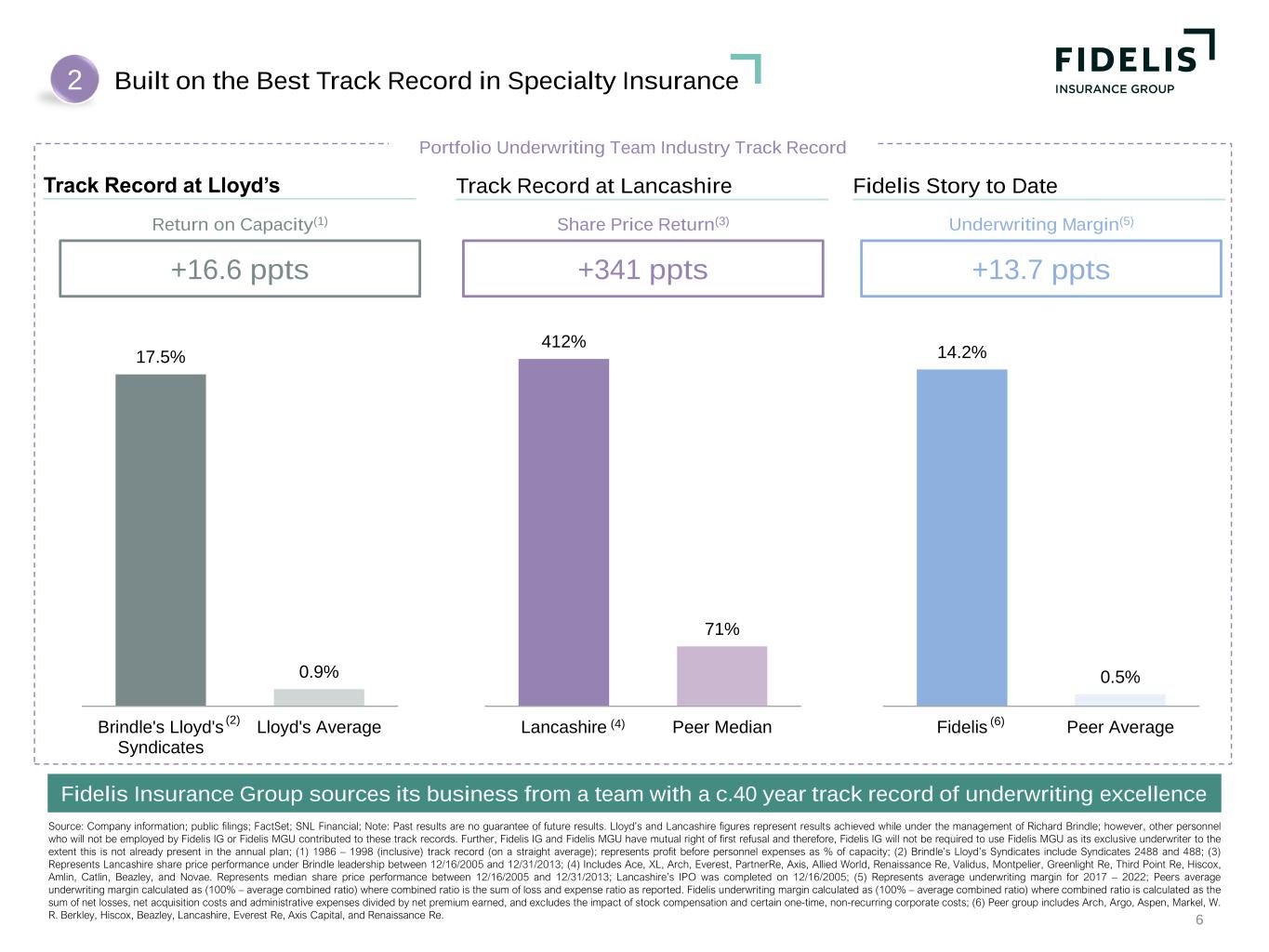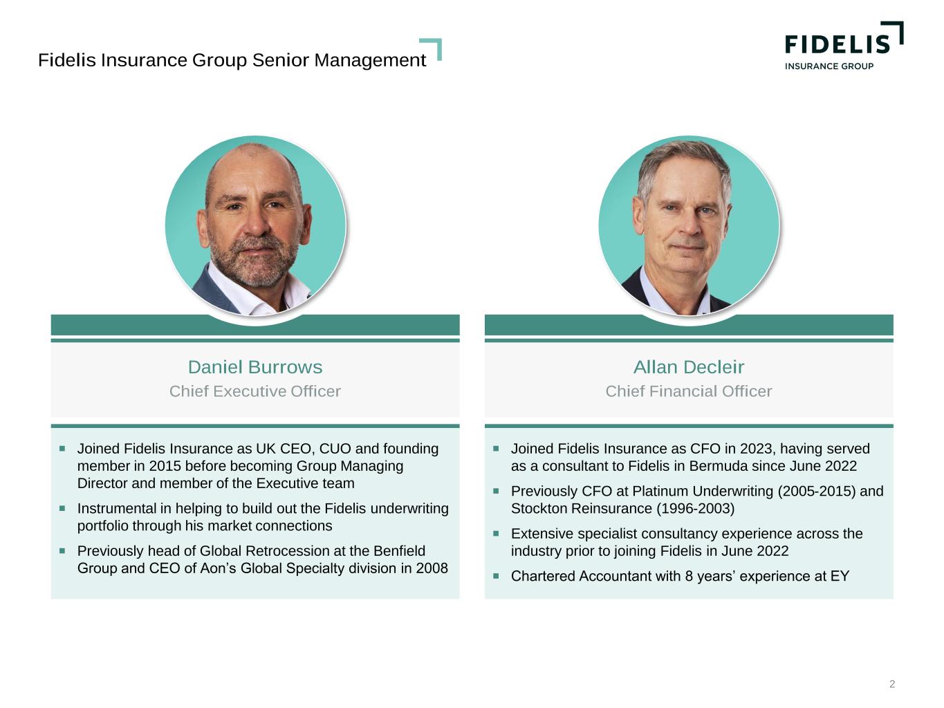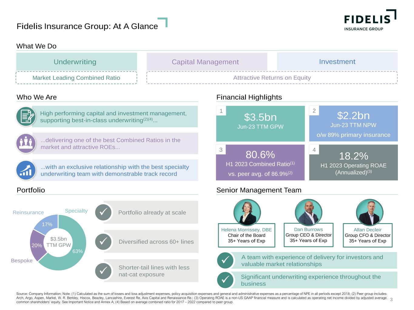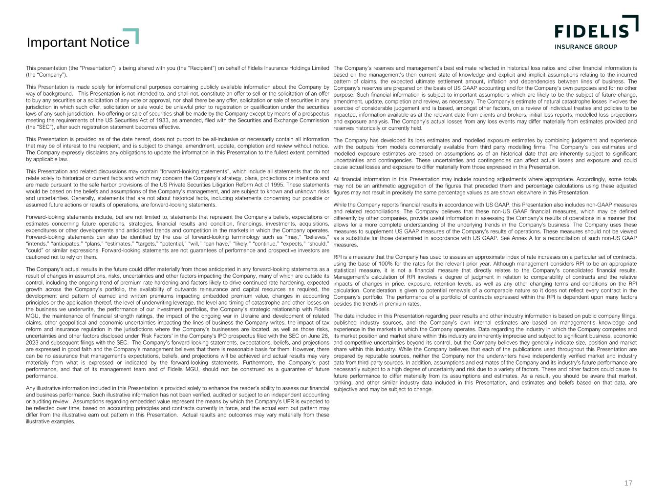 17本演示文稿(“演示文稿”)是代表Fidelis保险控股有限公司(“公司”)与您(“收件人”)分享的。本演示文稿仅供参考,包含有关公司的公开背景信息。本演示文稿无意也不应构成出售任何证券的要约或购买任何证券的要约邀请或任何投票或批准的邀请,也不应在根据任何此类司法管辖区的证券法进行登记或取得资格之前,在任何此类要约、邀请或出售将是非法的司法管辖区存在任何证券的要约、邀请或出售。公司不得发行或出售证券,除非在注册声明生效后,通过符合经修订的1933年美国证券法要求的招股说明书向美国证券交易委员会(“SEC”)提交。本演示文稿自本文件发布之日起提供,并不旨在包罗万象,也不一定包含收件人可能感兴趣的所有信息,如有更改、修改、更新、完成和审查,恕不另行通知。本公司明确表示不承担在适用法律允许的最大范围内更新本演示文稿中的信息的任何义务。本演示文稿和相关讨论可能包含“前瞻性陈述”,其中包括所有不完全与历史或当前事实相关的陈述,这些陈述可能涉及公司的战略、计划、预测或意图,并且是根据1995年美国私人证券诉讼改革法案的安全港条款做出的。这些陈述将基于公司管理层的信念和假设,并受到已知和未知风险和不确定性的影响。一般来说,与历史事实无关的陈述,包括关于我们可能或假定的未来行动或行动结果的陈述,都是前瞻性陈述。前瞻性陈述包括但不限于代表公司对未来运营、战略、财务业绩和状况、融资、投资、收购、支出或其他发展以及公司运营所在市场的预期趋势和竞争的信念、期望或估计的陈述。前瞻性陈述也可以通过使用前瞻性术语来识别,例如“可能”、“相信”、“打算”、“预期”、“计划”、“估计”、“目标”、“潜在”、“将”、“可能”、“可能”、“继续”、“预期”、“应该”、“可能”或类似的表达方式。前瞻性陈述不能保证业绩,告诫潜在投资者不要依赖这些陈述。由于假设、风险、不确定性和其他影响公司的因素的变化,公司未来的实际结果可能与任何前瞻性陈述中的预期存在重大差异,其中许多因素不在公司的控制范围内,包括持续的保险费率强化趋势和可能推动持续的保险费率强化的因素、公司投资组合的预期增长、根据需要提供再保险和资本资源、影响内含保费价值的已赚保费和书面保费的发展和模式、会计原则的变化或其应用、承保杠杆水平,我们承保的业务发生灾难和其他损失的程度和时间、我们投资组合的表现、公司与Fidelis MGU的战略关系、财务实力评级的维持、乌克兰持续战争的影响和相关索赔的发展、影响公司业务的其他地缘政治和经济不确定性、公司业务所在司法管辖区的税收改革和保险监管的影响以及这些风险,公司于2023年6月28日向SEC提交的IPO招股说明书及随后向SEC提交的文件中“风险因素”项下披露的不确定性和其他因素。公司的前瞻性陈述、预期、信念和预测是善意表达的,公司管理层认为这些陈述有合理的依据。然而,不能保证管理层的期望、信念和预测会实现,实际结果可能与前瞻性陈述所表达或表明的有很大差异。此外,公司过去的业绩,以及公司管理团队和Fidelis MGU的业绩, 不应被理解为对未来业绩的保证。本演示文稿中包含的任何说明性信息仅用于增强读者评估我们的财务和业务表现的能力。这些说明性资料未经核实、审计或接受独立的会计或审计审查。根据现行会计原则和合同,有关内含价值的假设是预期随着时间的推移反映公司普遍定期审议的方法,实际盈利模式可能与本说明中的说明性盈利模式不同。实际结果和结果可能与这些说明性例子大不相同。历史损失率和其他财务信息中反映的公司准备金和管理层的最佳估计数是基于管理层当时的知识状况以及与发生的索赔模式、预期最终结算金额、通货膨胀和业务之间的依赖关系有关的显性和隐性假设。公司的准备金是根据美国公认会计原则编制的,为公司自己的目的而不是其他目的。这些财务资料须以重要假设为准,这些假设很可能成为今后必要时进行变更、修正、更新、完成和审查的主题。该公司对自然灾害损失的估计需要作出相当大的判断,其依据除其他因素外,还包括对受影响的个别条约和政策的审查、截至有关日期从客户和经纪人获得的信息、初步损失报告、模拟损失预测和风险分析。公司因任何损失事件造成的实际损失可能与所提供的估计数和历史上或目前持有的准备金存在重大差异。公司通过将判断和经验与从第三方建模公司获得的商业模型的产出相结合,制定了损失估计和模拟风险估计。公司的损失估计数和模拟风险估计数是基于历史日期的假设,这些假设本身就具有重大的不确定性和意外情况。这些不确定性和意外情况可能会影响实际损失和风险敞口,并可能导致实际损失和风险敞口与本说明中所述的存在重大差异。本说明中的所有财务资料可酌情包括四舍五入调整数。因此,有些总数可能不是前面数字的算术汇总,使用这些调整后数字进行的百分比计算可能不会得出与本说明其他部分所示完全相同的百分比值。尽管公司按照美国公认会计原则报告财务业绩,但本演示文稿还包括非公认会计原则的衡量标准和相关的对账。公司认为,这些非美国公认会计原则的财务指标(其他公司可能有不同的定