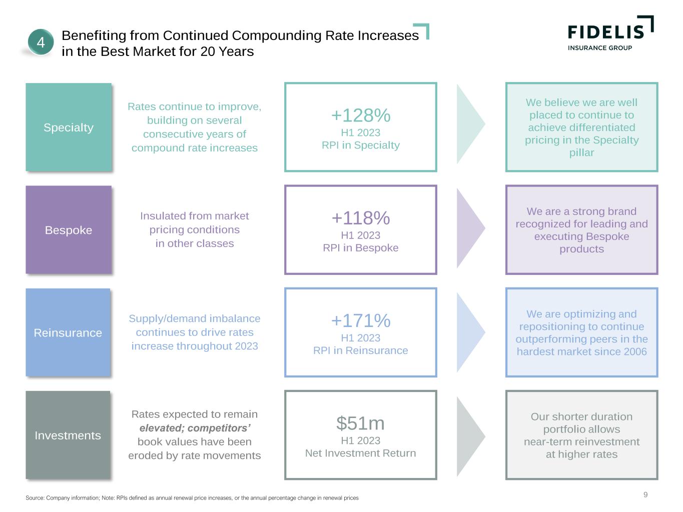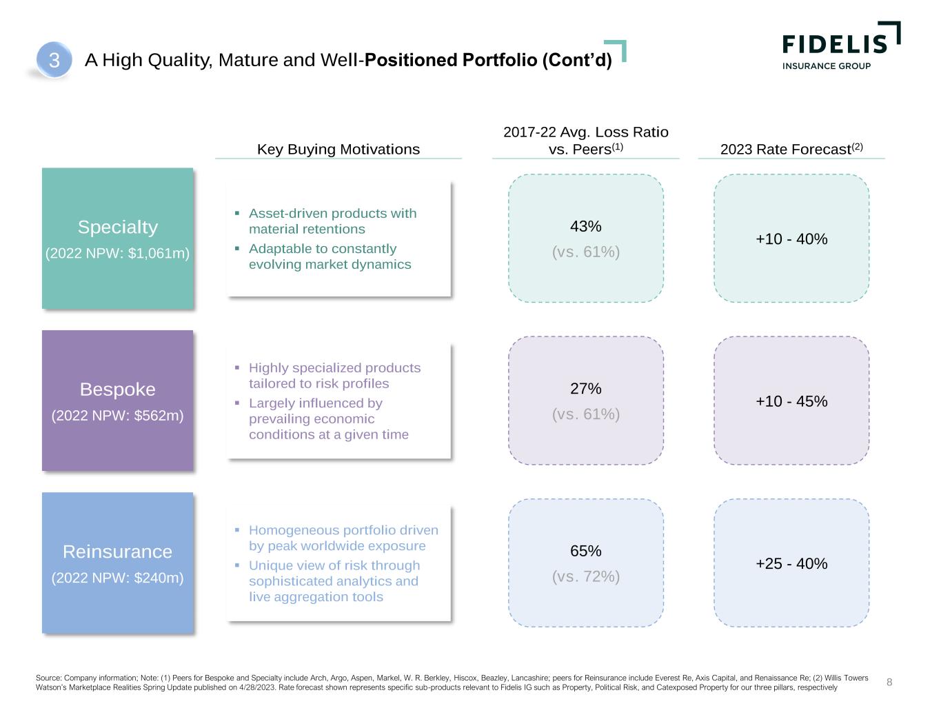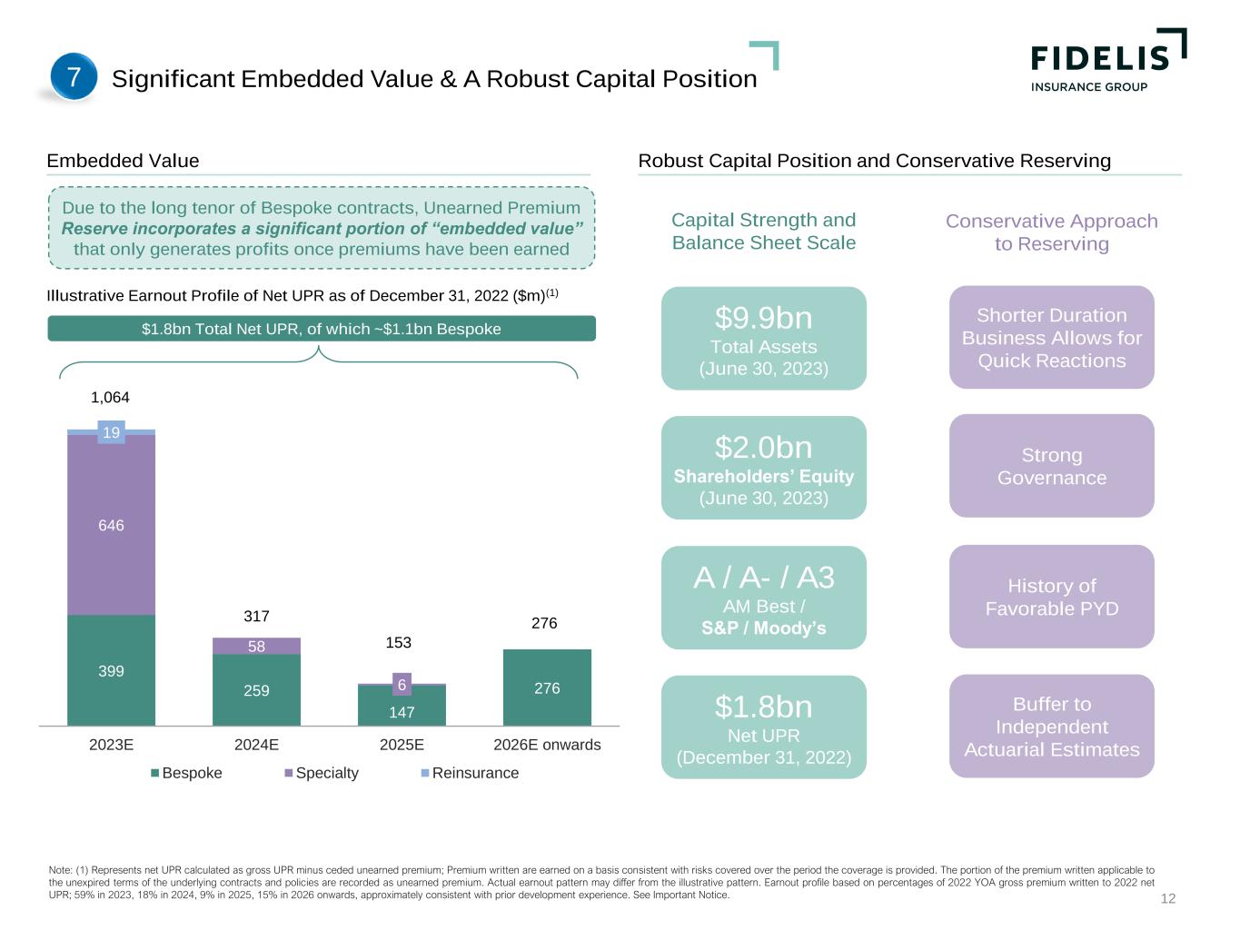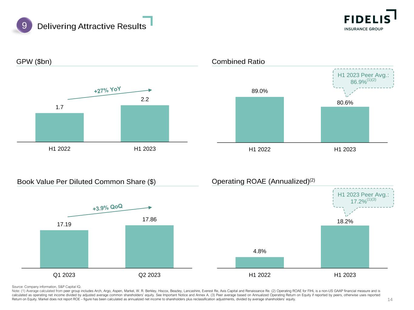 17本演示文稿(“演示文稿”)是代表Fidelis保险控股有限公司(“公司”)与您(“收件人”)分享的。本演示文稿仅供参考,包含有关公司的公开背景信息。本演示文稿无意也不应构成出售任何证券的要约或购买任何证券的要约邀请或任何投票或批准的邀请,也不应在根据任何此类司法管辖区的证券法进行登记或取得资格之前,在任何此类要约、邀请或出售将是非法的司法管辖区存在任何证券的要约、邀请或出售。公司不得发行或出售证券,除非在注册声明生效后,通过符合经修订的1933年美国证券法要求的招股说明书向美国证券交易委员会(“SEC”)提交。本演示文稿自本文件发布之日起提供,并不旨在包罗万象,也不一定包含收件人可能感兴趣的所有信息,如有更改、修改、更新、完成和审查,恕不另行通知。本公司明确表示不承担在适用法律允许的最大范围内更新本演示文稿中的信息的任何义务。本演示文稿和相关讨论可能包含“前瞻性陈述”,其中包括所有不完全与历史或当前事实相关的陈述,这些陈述可能涉及公司的战略、计划、预测或意图,并且是根据1995年美国私人证券诉讼改革法案的安全港条款做出的。这些陈述将基于公司管理层的信念和假设,并受到已知和未知风险和不确定性的影响。一般来说,与历史事实无关的陈述,包括关于我们可能或假定的未来行动或行动结果的陈述,都是前瞻性陈述。前瞻性陈述包括但不限于代表公司对未来运营、战略、财务业绩和状况、融资、投资、收购、支出或其他发展以及公司运营所在市场的预期趋势和竞争的信念、期望或估计的陈述。前瞻性陈述也可以通过使用前瞻性术语来识别,例如“可能”、“相信”、“打算”、“预期”、“计划”、“估计”、“目标”、“潜在”、“将”、“可能”、“可能”、“继续”、“预期”、“应该”、“可能”或类似的表达方式。前瞻性陈述不能保证业绩,告诫潜在投资者不要依赖这些陈述。由于假设、风险、不确定性和其他影响公司的因素的变化,公司未来的实际结果可能与任何前瞻性陈述中的预期存在重大差异,其中许多因素不在公司的控制范围内,包括持续的保险费率强化趋势和可能推动持续的保险费率强化的因素、公司投资组合的预期增长、根据需要提供再保险和资本资源、影响内含保费价值的已赚保费和书面保费的发展和模式、会计原则的变化或其应用、承保杠杆水平,我们承保的业务发生灾难和其他损失的程度和时间、我们投资组合的表现、公司与Fidelis MGU的战略关系、财务实力评级的维持、乌克兰持续战争的影响和相关索赔的发展、影响公司业务的其他地缘政治和经济不确定性、公司业务所在司法管辖区的税收改革和保险监管的影响以及这些风险,公司于2023年6月28日向SEC提交的IPO招股说明书及随后向SEC提交的文件中“风险因素”项下披露的不确定性和其他因素。公司的前瞻性陈述、预期、信念和预测是善意表达的,公司管理层认为这些陈述有合理的依据。然而,不能保证管理层的期望、信念和预测会实现,实际结果可能与前瞻性陈述所表达或表明的有很大差异。此外,公司过去的业绩,以及公司管理团队和Fidelis MGU的业绩, 不应被理解为对未来业绩的保证。本演示文稿中包含的任何说明性信息仅用于增强读者评估我们的财务和业务表现的能力。这些说明性资料未经核实、审计或接受独立的会计或审计审查。根据现行会计原则和合同,有关内含价值的假设是预期随着时间的推移反映公司普遍定期审议的方法,实际盈利模式可能与本说明中的说明性盈利模式不同。实际结果和结果可能与这些说明性例子大不相同。历史损失率和其他财务信息中反映的公司准备金和管理层的最佳估计数是基于管理层当时的知识状况以及与发生的索赔模式、预期最终结算金额、通货膨胀和业务之间的依赖关系有关的显性和隐性假设。公司的准备金是根据美国公认会计原则编制的,为公司自己的目的而不是其他目的。这些财务资料须以重要假设为准,这些假设很可能成为今后必要时进行变更、修正、更新、完成和审查的主题。该公司对自然灾害损失的估计需要作出相当大的判断,其依据除其他因素外,还包括对受影响的个别条约和政策的审查、截至有关日期从客户和经纪人获得的信息、初步损失报告、模拟损失预测和风险分析。公司因任何损失事件造成的实际损失可能与所提供的估计数和历史上或目前持有的准备金存在重大差异。公司通过将判断和经验与从第三方建模公司获得的商业模型的产出相结合,制定了损失估计和模拟风险估计。公司的损失估计数和模拟风险估计数是基于历史日期的假设,这些假设本身就具有重大的不确定性和意外情况。这些不确定性和意外情况可能会影响实际损失和风险敞口,并可能导致实际损失和风险敞口与本说明中所述的存在重大差异。本说明中的所有财务资料可酌情包括四舍五入调整数。因此,有些总数可能不是前面数字的算术汇总,使用这些调整后数字进行的百分比计算可能不会得出与本说明其他部分所示完全相同的百分比值。尽管公司按照美国公认会计原则报告财务业绩,但本演示文稿还包括非公认会计原则的衡量标准和相关的对账。公司认为,这些非美国公认会计原则的财务指标(其他公司可能有不同的定