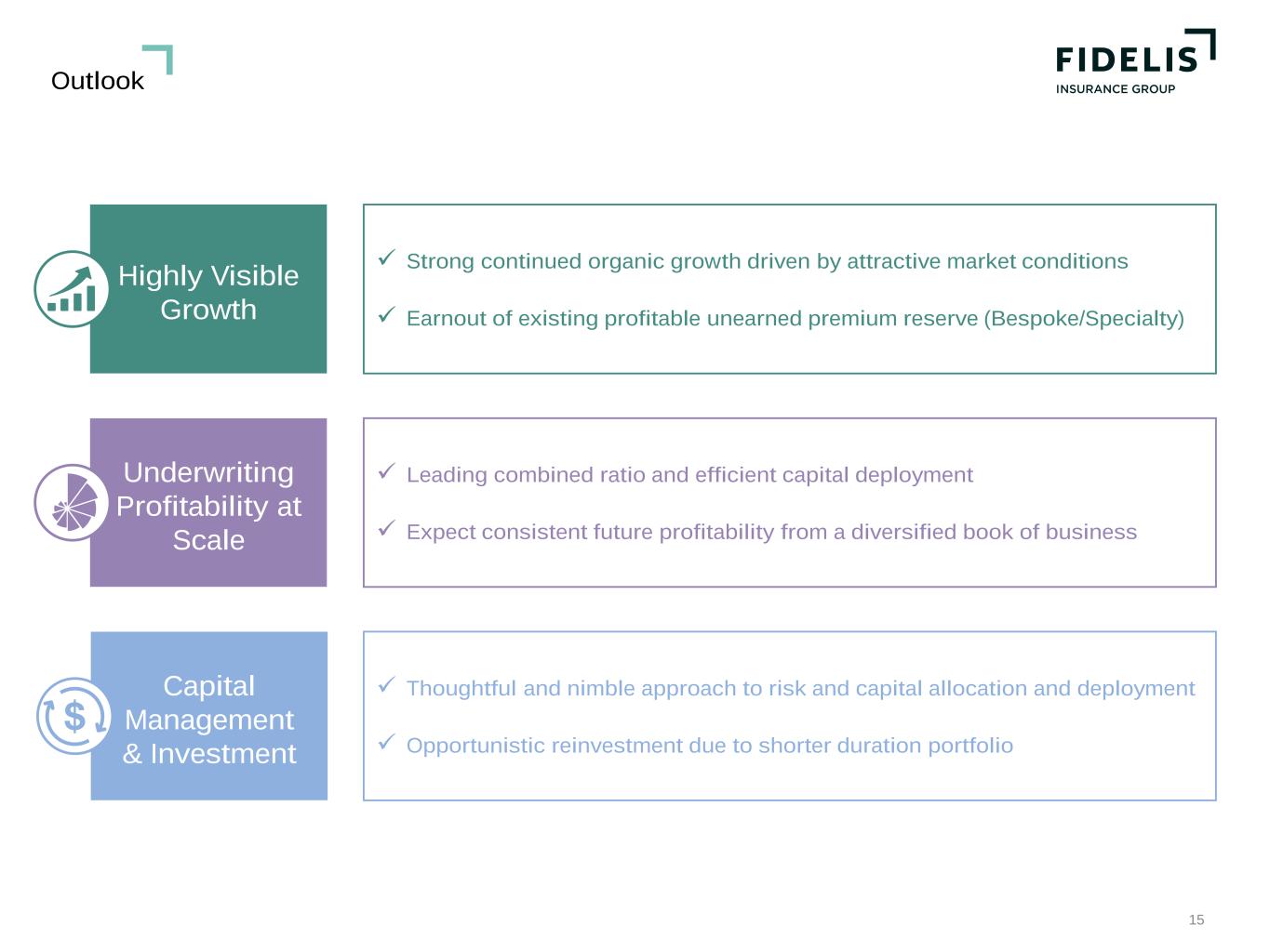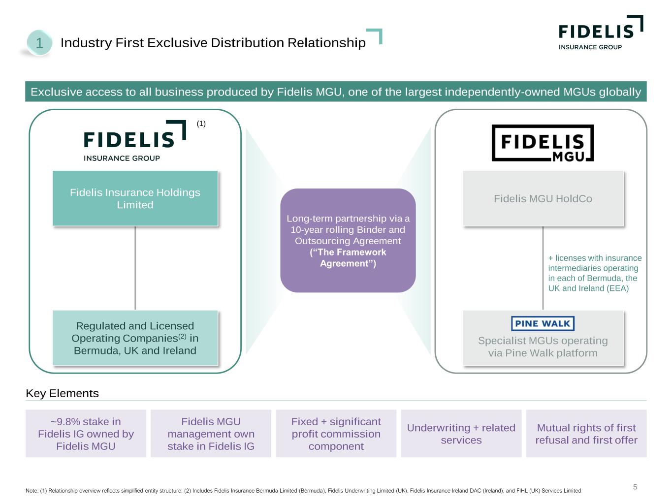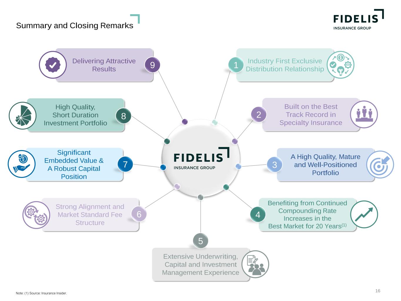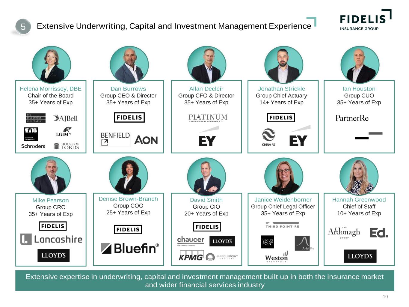 17本演示文稿(“演示文稿”)是代表Fidelis保险控股有限公司(“公司”)与您(“收件人”)分享的。本演示文稿仅供参考,包含有关公司的公开背景信息。本演示文稿无意也不应构成出售任何证券的要约或购买任何证券的要约邀请或任何投票或批准的邀请,也不应在根据任何此类司法管辖区的证券法进行登记或取得资格之前,在任何此类要约、邀请或出售将是非法的司法管辖区存在任何证券的要约、邀请或出售。公司不得发行或出售证券,除非在注册声明生效后,通过符合经修订的1933年美国证券法要求的招股说明书向美国证券交易委员会(“SEC”)提交。本演示文稿自本文件发布之日起提供,并不旨在包罗万象,也不一定包含收件人可能感兴趣的所有信息,如有更改、修改、更新、完成和审查,恕不另行通知。本公司明确表示不承担在适用法律允许的最大范围内更新本演示文稿中的信息的任何义务。本演示文稿和相关讨论可能包含“前瞻性陈述”,其中包括所有不完全与历史或当前事实相关的陈述,这些陈述可能涉及公司的战略、计划、预测或意图,并且是根据1995年美国私人证券诉讼改革法案的安全港条款做出的。这些陈述将基于公司管理层的信念和假设,并受到已知和未知风险和不确定性的影响。一般来说,与历史事实无关的陈述,包括关于我们可能或假定的未来行动或行动结果的陈述,都是前瞻性陈述。前瞻性陈述包括但不限于代表公司对未来运营、战略、财务业绩和状况、融资、投资、收购、支出或其他发展以及公司运营所在市场的预期趋势和竞争的信念、期望或估计的陈述。前瞻性陈述也可以通过使用前瞻性术语来识别,例如“可能”、“相信”、“打算”、“预期”、“计划”、“估计”、“目标”、“潜在”、“将”、“可能”、“可能”、“继续”、“预期”、“应该”、“可能”或类似的表达方式。前瞻性陈述不能保证业绩,告诫潜在投资者不要依赖这些陈述。由于假设、风险、不确定性和其他影响公司的因素的变化,公司未来的实际结果可能与任何前瞻性陈述中的预期存在重大差异,其中许多因素不在公司的控制范围内,包括持续的保险费率强化趋势和可能推动持续的保险费率强化的因素、公司投资组合的预期增长、根据需要提供再保险和资本资源、影响内含保费价值的已赚保费和书面保费的发展和模式、会计原则的变化或其应用、承保杠杆水平,我们承保的业务发生灾难和其他损失的程度和时间、我们投资组合的表现、公司与Fidelis MGU的战略关系、财务实力评级的维持、乌克兰持续战争的影响和相关索赔的发展、影响公司业务的其他地缘政治和经济不确定性、公司业务所在司法管辖区的税收改革和保险监管的影响以及这些风险,公司于2023年6月28日向SEC提交的IPO招股说明书及随后向SEC提交的文件中“风险因素”项下披露的不确定性和其他因素。公司的前瞻性陈述、预期、信念和预测是善意表达的,公司管理层认为这些陈述有合理的依据。然而,不能保证管理层的期望、信念和预测会实现,实际结果可能与前瞻性陈述所表达或表明的有很大差异。此外,公司过去的业绩,以及公司管理团队和Fidelis MGU的业绩, 不应被理解为对未来业绩的保证。本演示文稿中包含的任何说明性信息仅用于增强读者评估我们的财务和业务表现的能力。这些说明性资料未经核实、审计或接受独立的会计或审计审查。根据现行会计原则和合同,有关内含价值的假设是预期随着时间的推移反映公司普遍定期审议的方法,实际盈利模式可能与本说明中的说明性盈利模式不同。实际结果和结果可能与这些说明性例子大不相同。历史损失率和其他财务信息中反映的公司准备金和管理层的最佳估计数是基于管理层当时的知识状况以及与发生的索赔模式、预期最终结算金额、通货膨胀和业务之间的依赖关系有关的显性和隐性假设。公司的准备金是根据美国公认会计原则编制的,为公司自己的目的而不是其他目的。这些财务资料须以重要假设为准,这些假设很可能成为今后必要时进行变更、修正、更新、完成和审查的主题。该公司对自然灾害损失的估计需要作出相当大的判断,其依据除其他因素外,还包括对受影响的个别条约和政策的审查、截至有关日期从客户和经纪人获得的信息、初步损失报告、模拟损失预测和风险分析。公司因任何损失事件造成的实际损失可能与所提供的估计数和历史上或目前持有的准备金存在重大差异。公司通过将判断和经验与从第三方建模公司获得的商业模型的产出相结合,制定了损失估计和模拟风险估计。公司的损失估计数和模拟风险估计数是基于历史日期的假设,这些假设本身就具有重大的不确定性和意外情况。这些不确定性和意外情况可能会影响实际损失和风险敞口,并可能导致实际损失和风险敞口与本说明中所述的存在重大差异。本说明中的所有财务资料可酌情包括四舍五入调整数。因此,有些总数可能不是前面数字的算术汇总,使用这些调整后数字进行的百分比计算可能不会得出与本说明其他部分所示完全相同的百分比值。尽管公司按照美国公认会计原则报告财务业绩,但本演示文稿还包括非公认会计原则的衡量标准和相关的对账。公司认为,这些非美国公认会计原则的财务指标(其他公司可能有不同的定