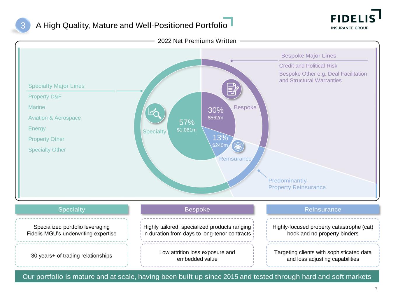6建立在专业保险的最佳业绩记录上+ 16.6个百分点产能回报率(1)+ 341个百分点股价回报率(3)+ 13.7个百分点承保利润率(5)17.5% 0.9% Brindle‘s Lloyd’s Syndicates Lloyd's Average 412% 71% Lancashire Peer Median 14.2% 0.5% Fidelis Peer Average资料来源:公司信息;公开文件;FactSet;SNL Financial;注:过去的业绩不能保证未来的业绩。劳合社和兰开夏郡的数字代表在理查德·布林德尔的管理下取得的成果;然而,其他不会受雇于Fidelis IG或Fidelis MGU的人员对这些业绩作出了贡献。此外,Fidelis IG和Fidelis MGU拥有相互的优先购买权,因此,Fidelis IG将不需要使用Fidelis MGU作为其独家承销商,只要这一点尚未出现在年度计划中;(1)1986 – 1998年(含)往绩记录(以直线平均数计算);表示扣除人事费用前的利润占产能的百分比;(2)Brindle’s Lloyd’s Syndicates包括辛迪加2488和488;(3)代表Brindle领导下的兰开夏郡股价在2005年12月16日至2013年12月31日期间的表现;(4)包括Ace、XL、Arch、Everest、PartnerRe、Axis、Allied World、Renaissance Re、Validus、Montpelier、GreenlightThird Point Re,Hiscox,Amlin,Catlin,Beazley和Novae。代表2005年12月16日至2013年12月31日期间的股价表现中值;兰开夏郡的IPO于2005年12月16日完成;(5)代表2017 – 2022年的平均承销利润率;同行平均承销利润率计算为(100% –平均合并比率),其中合并比率为报告的亏损和费用比率之和。Fidelis的承保利润率计算为(100% –平均合并比率),其中合并比率计算为净亏损、净收购成本和管理费用之和除以净保费收入,不包括股票补偿和某些一次性、非经常性公司成本的影响;(6)同行包括Arch、Argo、Aspen、马克尔保险、WR柏克利、Hiscox、Beazley、Lancashire、Everest Re、Axis Capital和Renaissance Re。(2)(4)(6)劳合社在兰开夏郡的往绩记录Fidelis迄今为止的故事Fidelis保险集团的业务来自一个拥有约40年卓越承保记录的团队2投资组合承保团队行业往绩记录