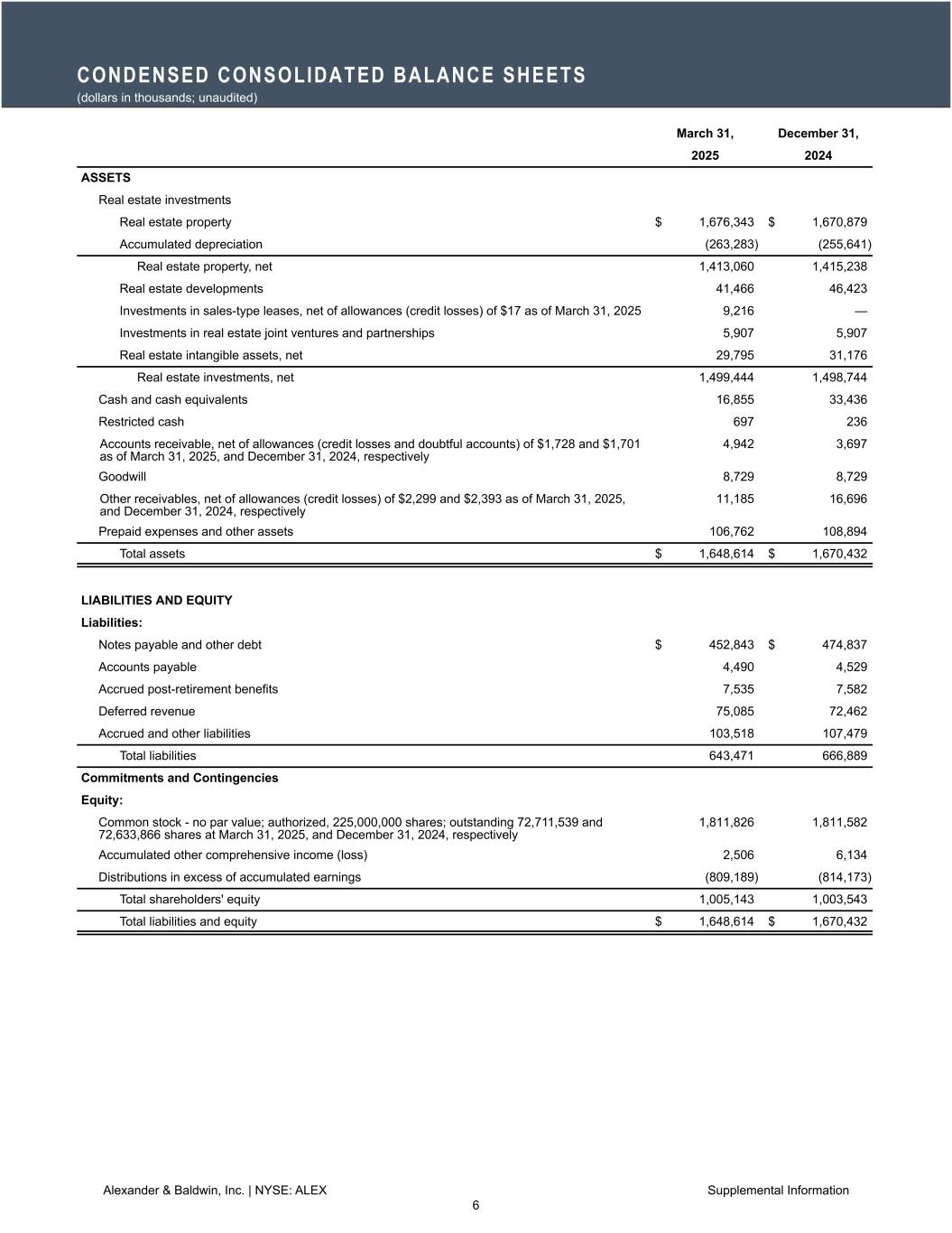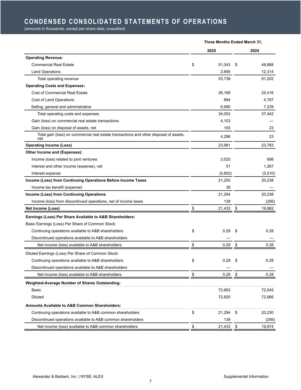 简明合并经营报表(金额以千为单位,每股数据除外;未经审计)截至2025年3月31日的三个月2024年营业收入:商业不动产51,043美元48,888美元土地经营2,69512,314总营业收入53,73861,202营业成本和费用:商业不动产成本26,16925,416土地经营成本8944,787销售、一般和行政费用6,9907,239总营业成本和费用34,05337,442商业不动产交易收益(损失)4,103 —处置资产收益(损失)净额19323商业不动产交易和其他处置资产收益(损失)总额,净额4,29623营业收入(亏损)23,98123,783其他收入和(费用):与合营企业相关的收入(亏损)3,025698利息和其他收入(费用),净额511,267利息支出(5,802)(5,510)所得税前持续经营收入(亏损)21,25520,238所得税优惠(费用)39 —持续经营收入(亏损)21,29420,238终止经营收入(亏损),扣除所得税139(256)净收入(亏损)21,433美元19,982美元A & B股东可获得的每股收益(亏损):每股普通股基本收益(亏损):A & B股东可获得的持续经营业务0.29美元0.28美元A & B股东可获得的已终止经营业务—— A & B股东可获得的净收入(亏损)0.29美元0.28美元稀释后每股普通股收益(亏损):A & B股东可获得的持续经营业务0.29美元0.28美元A & B股东可获得的已终止经营业务—— A & B股东可获得的净收入(亏损)0.29美元0.28美元加权平均流通股数:A & B普通股股东可获得的基本72,68372,545稀释后72,82072,666金额:A & B普通股股东可获得的持续经营业务21,294美元20,230美元A & B普通股股东可获得的已终止经营业务139(256)A & B普通股股东可获得的净收入(亏损)21,433美元19,974美元Alexander & Baldwin, Inc. |纽约证券交易所代码:ALEX补充信息7