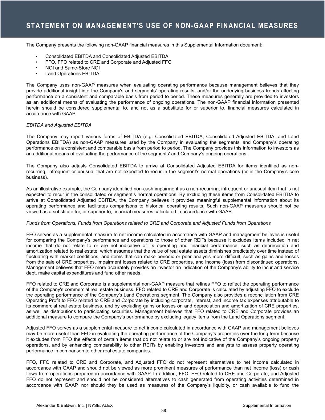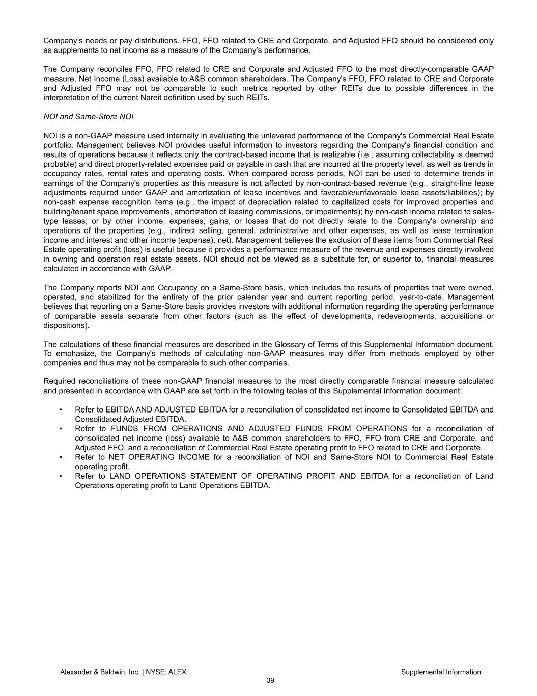 关于管理层使用非公认会计准则财务指标的声明公司在本补充信息文件中提出了以下非公认会计准则财务指标:•合并EBITDA和合并调整后EBITDA • FFO、与CRE和公司相关的FFO和调整后的FFO • NOI和同店NOI •土地运营EBITDA公司在评估经营业绩时使用非公认会计准则指标,因为管理层认为它们提供了对公司和分部经营业绩的额外洞察,和/或在不同时期的一致和可比基础上影响业绩的基本业务趋势。这些措施一般提供给投资者,作为评估持续经营业绩的额外手段。此处提供的非GAAP财务信息应被视为对根据GAAP计算的财务指标的补充,而不是替代或优于。EBITDA和调整后EBITDA公司可能会报告各种形式的EBITDA(例如合并EBITDA、合并调整后EBITDA和土地运营EBITDA),作为公司在不同时期以一致和可比的基础评估分部和公司经营业绩时使用的非公认会计原则衡量标准。公司向投资者提供这些信息,作为评估分部业绩和公司持续经营的额外手段。公司还对合并EBITDA进行调整,以得出被确定为非经常性、不经常或不寻常的项目的合并调整后EBITDA,这些项目预计不会在该部门的正常运营(或公司的核心业务)中重复发生。作为一个说明性的例子,公司将非现金减值确定为预计不会在合并或分部的正常运营中再次发生的非经常性、不经常或不寻常的项目。通过将这些项目从合并EBITDA中剔除以得出合并调整后EBITDA,公司认为这提供了有关其经营业绩的有意义的补充信息,并有助于与历史经营业绩进行比较。此类非公认会计原则措施不应被视为替代或优于根据公认会计原则计算的财务措施。来自运营的资金、与CRE和公司相关的运营资金以及来自运营FFO的调整后资金可作为根据公认会计原则计算的净收入的补充衡量标准,管理层认为,这有助于将公司的业绩和运营与其他REITs的业绩和运营进行比较,因为它不包括净收入中包含的与其运营和财务业绩无关或不具有指示性的项目,例如与房地产相关的折旧和摊销,后者假设房地产资产的价值随着时间的推移而可预测地减少,而不是随市场条件波动,以及可能使定期或同行分析更加困难的项目,例如出售CRE物业的损益、与CRE物业相关的减值损失以及终止经营业务的收入(亏损)。管理层认为,FFO更准确地为投资者提供了公司产生和偿还债务、进行资本支出和为其他需求提供资金的能力的指标。与CRE和Corporate相关的FFO是一种补充性的非GAAP衡量标准,它对FFO进行了细化,以反映公司商业地产业务的经营业绩。与CRE和Corporate相关的FFO是通过调整FFO来计算的,以排除公司土地运营部门的经营业绩。该公司还提供了CRE营业利润与与CRE和公司相关的FFO的对账,方法是计入归属于其商业房地产业务的公司、利息和所得税费用,并排除CRE财产的损益、折旧和摊销,以及对参与证券的分配。管理层认为,与CRE和Corporate相关的FFO提供了一个额外的衡量标准,通过将遗留项目排除在土地运营部门之外来比较公司的业绩。调整后的FFO可作为根据公认会计原则计算的净收入的补充衡量标准,管理层认为,在评估公司物业的长期经营业绩方面,可能比FFO更有用,因为它从FFO中排除了与公司正在进行的物业经营无关或不具有指示性的某些项目的影响,并通过使投资者和分析师能够评估与其他房地产公司相比的物业经营业绩来增强与其他REITs的可比性。FFO,与CRE和企业相关的FFO, 调整后的FFO不代表根据GAAP计算的净收入的替代方案,不应被视为比根据GAAP编制的净收入(亏损)或运营现金流更突出的业绩衡量标准。此外,FFO、与CRE和企业相关的FFO以及调整后的FFO不代表也不应被视为根据公认会计原则确定的经营活动产生的现金的替代方案,也不应将其用作衡量公司流动性的指标,或可用于为Alexander & Baldwin, Inc.提供资金的现金|纽约证券交易所代码:ALEX补充信息38