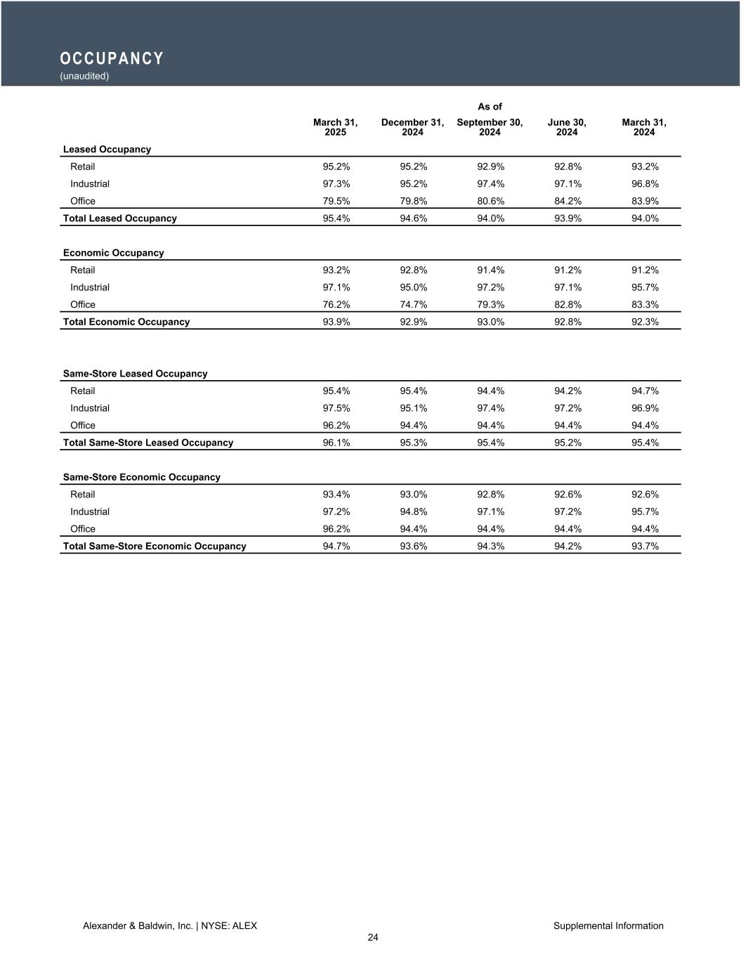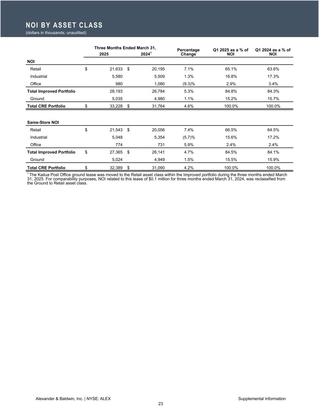 按资产类别划分的NOI(千美元;未经审计)截至3月31日的三个月,2025年第一季度占2024年第一季度NOI的百分比变化占NOI2025的百分比20241 NOI Retail $ 21,633 $ 20,1957.1% 65.1% 63.6% Industrial 5,5805,5091.3% 16.8% 17.3% Office 9801,080(9.3)% 2.9% 3.4% Total Improved Portfolio 28,19326,7845.3% 84.8% 84.3% Ground 5,0354,9801.1% 15.2% 15.7% Total CRE Portfolio $ 33,228 $ 31,7644.6% 100.0%同店NOI Retail $ 21,543 $ 20,0567.4% 66.5% 64.5% Industrial 5,0485,354(5.7)% 15.6% 17.2% Office 7747315.9% 2.4% Total Improved Portfolio $ 27,365 $ 26,1414.7% 84.5% 84.1% Ground 5截至2025年3月31日止三个月,Kailua Post Office地租移至经改善投资组合内的零售资产类别。出于可比性目的,与截至2024年3月31日止三个月的10万美元租赁相关的NOI从地面重新分类为零售资产类别。Alexander & Baldwin, Inc. | NYSE:ALEX补充资料23