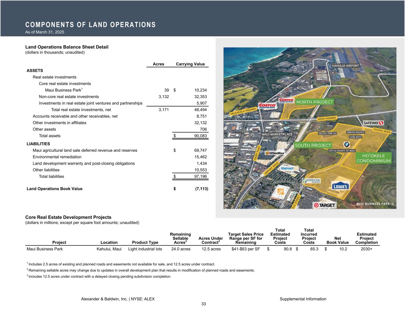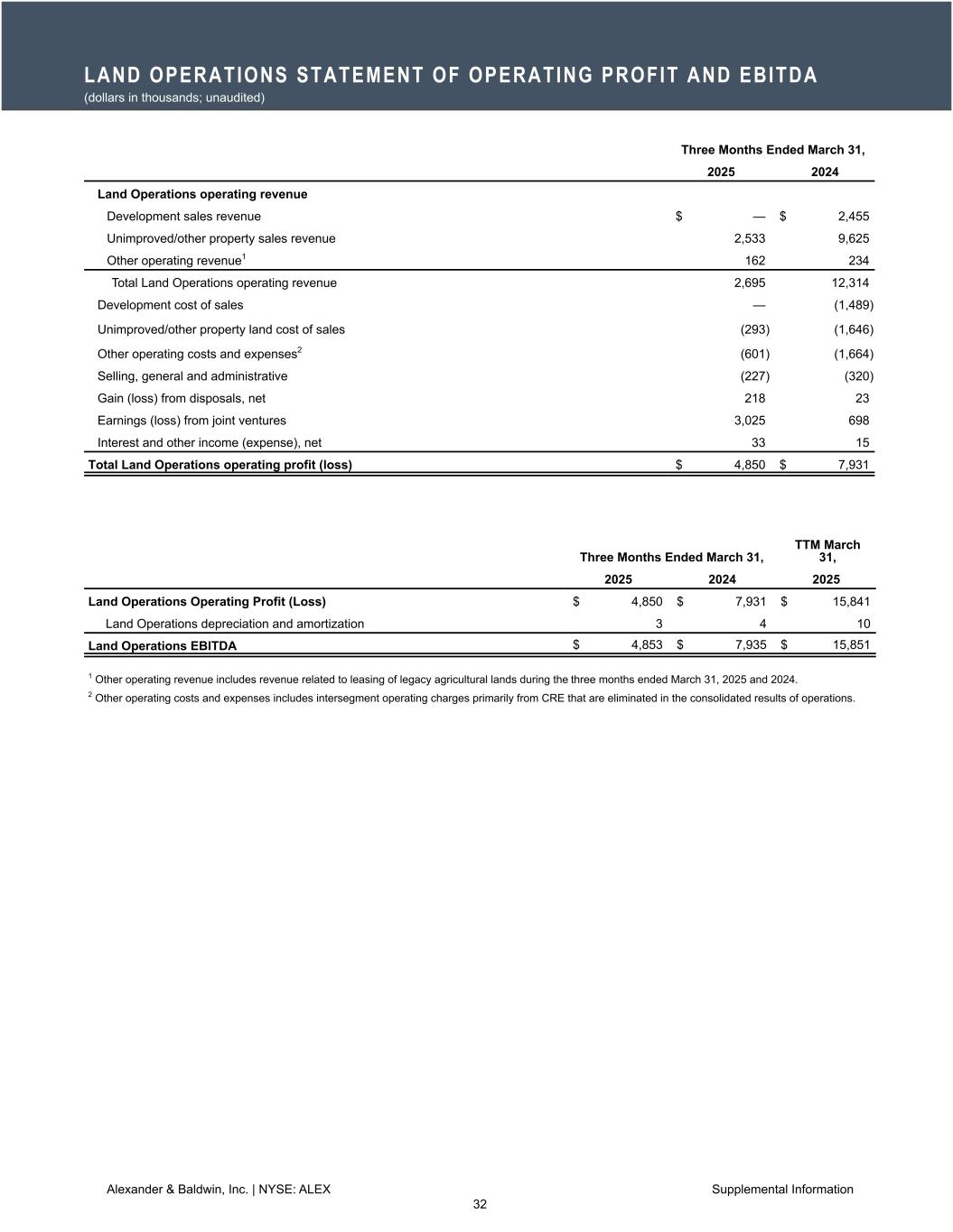 土地运营营业利润和EBITDA报表(单位:千美元;未经审计)截至2025年3月31日的三个月2024年土地运营营业收入开发销售收入$ — $ 2,455未改善/其他物业销售收入2,5339,625其他营业收入1162234土地运营营业总收入2,69512,314开发销售成本—(1,489)未改善/其他物业土地销售成本(293)(1,646)其他运营成本和费用2(601)(1,664)销售、一般和行政(227)(320)处置收益(亏损)净额21823来自合营企业的收益(亏损)3,025698利息和其他收入(费用),净额3315土地业务营业利润总额(亏损)4,850美元7,931美元截至2025年3月31日止三个月的三个月TTM 20242025土地业务营业利润(亏损)4,850美元7,931美元15,841美元土地业务折旧和摊销3410土地业务EBITDA 4,853美元7,935美元15,8511其他营业收入包括截至2025年3月31日和2024年3月31日止三个月与租赁遗留农业用地相关的收入。2其他经营成本和费用包括主要来自CRE的分部间经营费用,这些费用在综合经营业绩中消除。Alexander & Baldwin, Inc. | NYSE:ALEX补充信息32