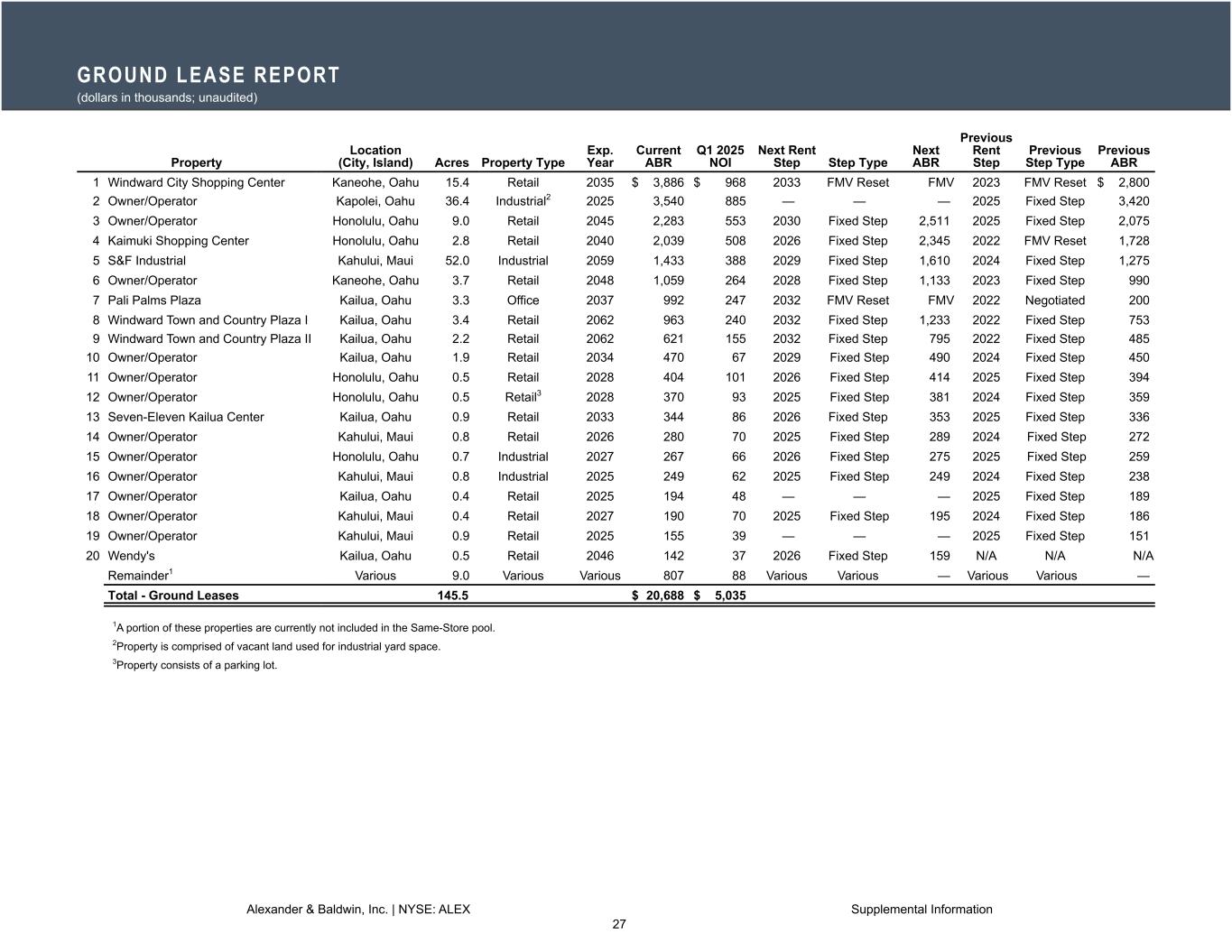 地租报告(单位:千美元;未经审计)物业位置(城市、岛屿)英亩物业类型exp.年份当前ABR Q1 2025 NOI下一个租金步骤类型Next ABR上一个租金步骤上一个步骤类型previous ABR 1 Windward City Shopping Center Kaneohe,Oahu 15.4 Retail 2035 $ 3,886 $ 9682033 FMV reset FMV 2023 FMV reset $ 2,8002 Owner/Operator Kapolei,Oahu 36.4 Industrial220253,540885 —— 2025 Fixed Step 3,4203 Owner/Operator Honolulu,Oahu 9.0 Retail 20452,2835532030 Fixed Step 2,5112025 Fixed Step 2,0754 Kaim欧胡岛2.8零售20402,0395082026固定步骤2,3452022 FMV重置1,7285 S & F Industrial Kahului,Maui 52.0 Industrial 20591,4333882029固定步骤1,6102024固定步骤1,2756所有者/经营者Kaneohe,Oahu 3.7零售20481,0592642028固定步骤1,1332023固定步骤9907 Pali Palms Plaza Kailua,Oahu 3.3 Office 20379922472032 FMV Reset FMV 2022 Negotiated 2008 Windward Town and Country Plaza I Kailua,Oahu 3.4 Retail 20629632402032 Fixed Step 1,2332022 Fixed欧胡岛2.2零售20626211552032固定步骤7952022固定步骤48510业主/经营者Kailua,Oahu 1.9零售2034470672029固定步骤4902024固定步骤45011业主/经营者火奴鲁鲁,瓦胡岛0.5零售20284041012026固定步骤4142025固定步骤39412业主/经营者火奴鲁鲁,瓦胡岛0.5零售32028370932025固定步骤3812024固定步骤35913七十一Kailua Center Kailua,Oahu 0.9零售2033344862026固定步骤3532025固定步骤33614业主/经营者Kahului,毛伊岛0.8零售2026280702025固定步骤2892024固定步骤27215所有者/运营商檀香山,瓦胡岛0.7工业2027267662026固定步骤2752025固定步骤25916所有者/运营商Kahului,毛伊岛0.8工业20259249622025固定步骤2492024固定步骤23817所有者/运营商Kailua,瓦胡岛0.4零售202519448 ———— 2025固定步骤18918所有者/运营商Kahului,毛伊岛0.4零售2027190702025固定步骤1952024固定步骤18619所有者/运营商Kahului,毛伊岛0.9零售202515539 ———— 2025年固定步骤15120 Wendy's Kailua,Oahu 0.5零售2046142372026固定步骤159 N/A N/A N/A N/A Remainder1 Various 9.0 Various Various 80788 Various various — various various various — total-地租145.5 $ 20,688 $ 5,035这些物业的一部分目前不包括在同店池中。2物业由用作工业场地空间的空地组成。3Property由一个停车场组成。Alexander & Baldwin, Inc. | NYSE:ALEX补充信息27