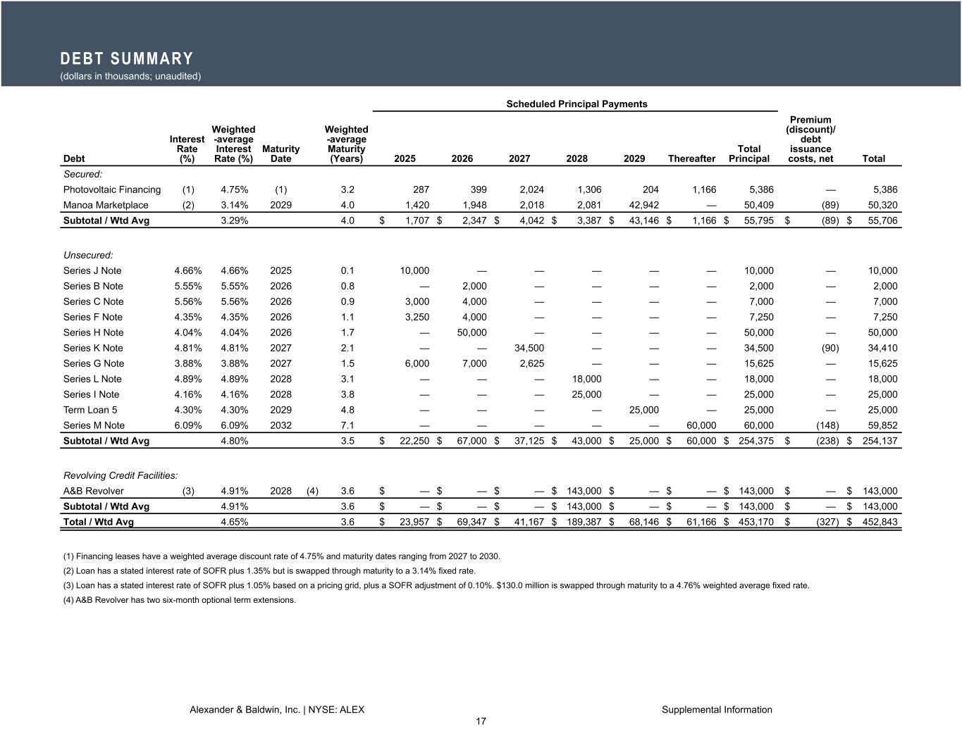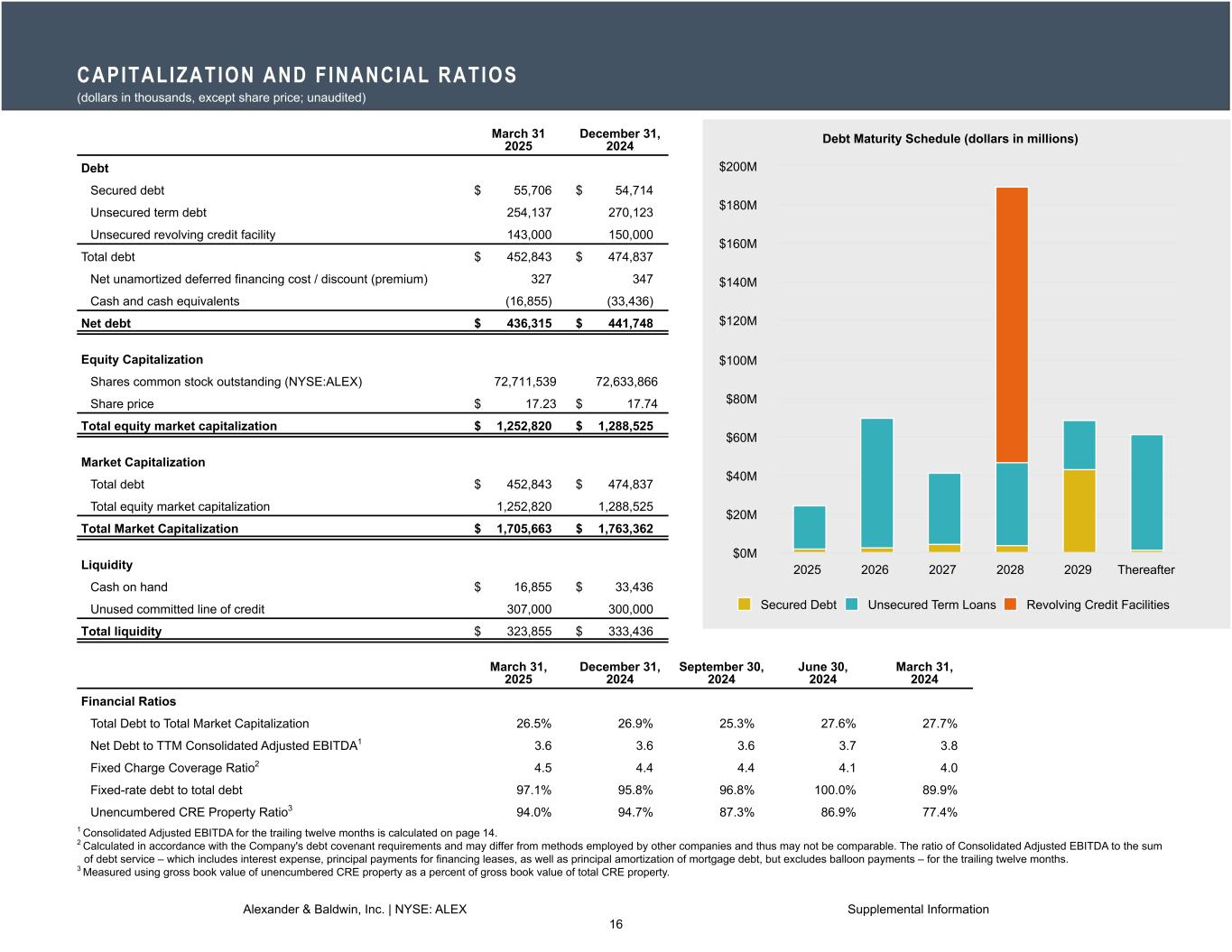 资本化和财务比率(千美元,股价除外;未经审计)2025年3月31日12月31日,2024年债务担保债务$ 55,706 $ 54,714无担保定期债务254,137270,123无担保循环信贷额度143,000150,000总债务$ 452,843 $ 474,837未摊销递延融资成本/贴现(溢价)净额327347现金和现金等价物(16,855)(33,436)净债务$ 436,315 $ 441,748已发行普通股(NYSE:ALEX)72,711,53972,633,866股价$ 17.23 $ 17.74总股本市值$ 1,252,820 $ 1,288,525市值总债务$ 452,843 $ 474,837总股本市值1,252,8201,288,525总市值$ 1,705,663 $ 1,763,362手头现金$ 16,855 $ 33,436未使用承诺信用额度307,000300,000总流动资金$ 323,855 $ 333,436 March 31,2025 December 31,2024 September 30,2024 June 30,2024 March 31,2024年财务比率总债务与总市值的比率26.5% 26.9% 25.3% 27.6% 27.7%净债务与TTM合并调整后EBITDA 1 3.6 3.6 3.6 3.7 3.8固定费用覆盖率24.54.4 4.4 4.14.0固定利率债务与总债务的比率97.1% 95.8% 96.8% 100.0% 89.9%未设押CRE财产比率3 94.0% 94.7% 87.3% 86.9% 77.4% 1过去十二个月的合并调整后EBITDA在第14页计算。2根据公司的债务契约要求计算,可能与其他公司采用的方法不同,因此可能无法进行比较。过去12个月的合并调整后EBITDA与偿债总额的比率——包括利息支出、融资租赁的本金支付以及抵押债务的本金摊销,但不包括气球付款。3使用未设押CRE财产的账面总值占CRE总财产账面总值的百分比来衡量。Alexander & Baldwin, Inc. | NYSE:ALEX补充信息16债务到期时间表(百万美元)有担保债务无担保定期贷款循环信贷便利20252026202720282029此后000万美元2000万美元4000万美元6000万美元8000万美元1亿美元1.2亿美元1.4亿美元1.6亿美元1.8亿美元2亿美元